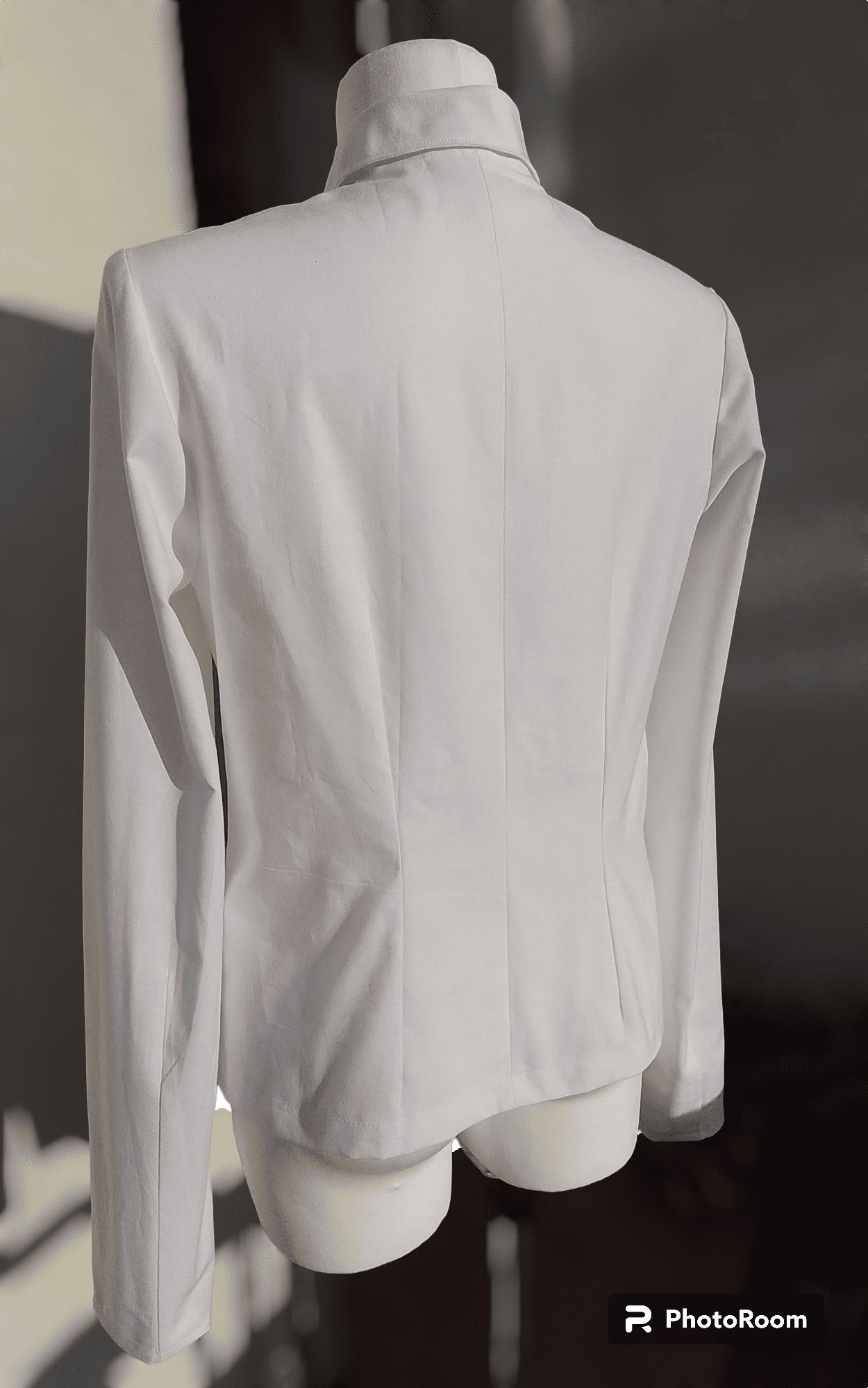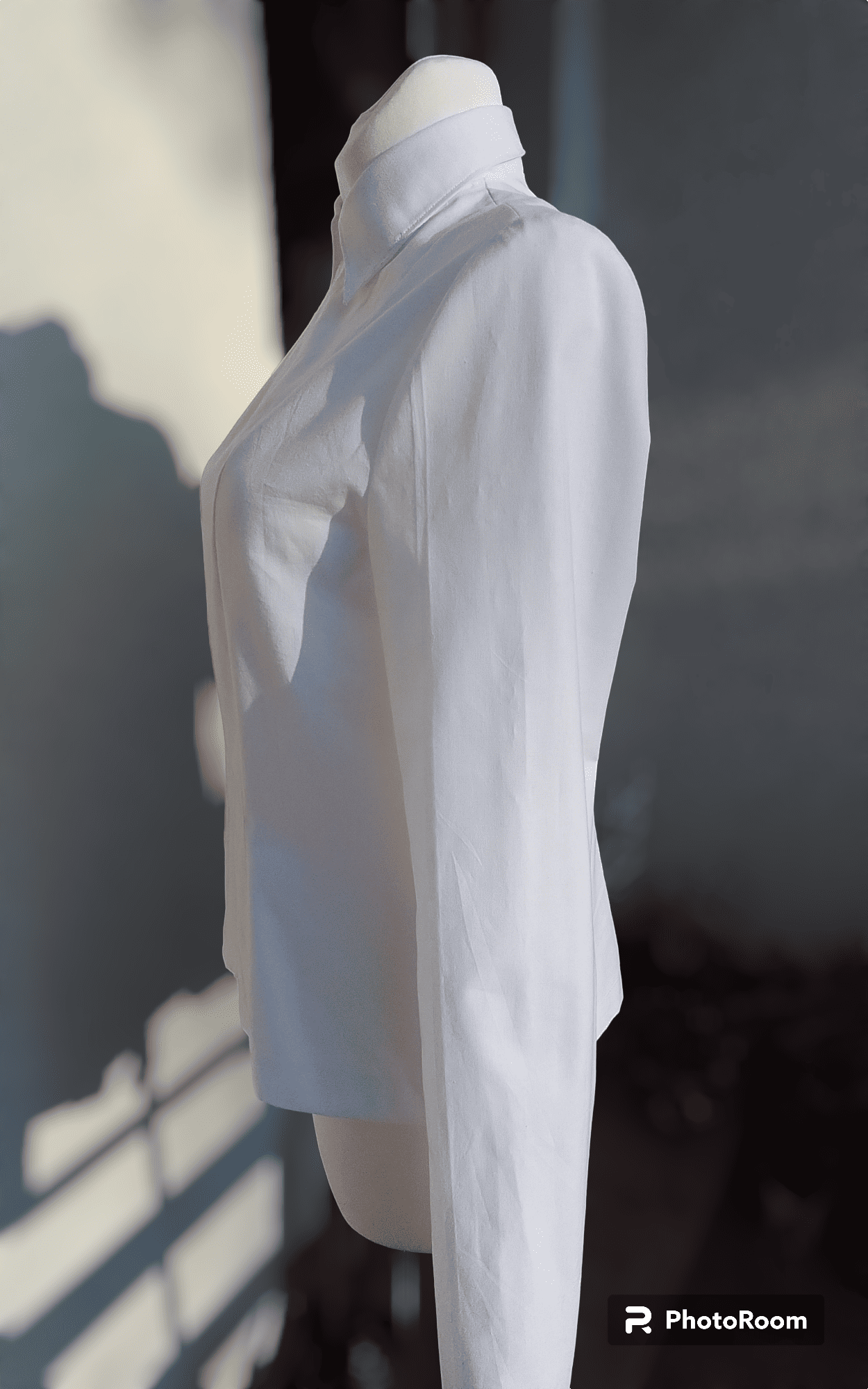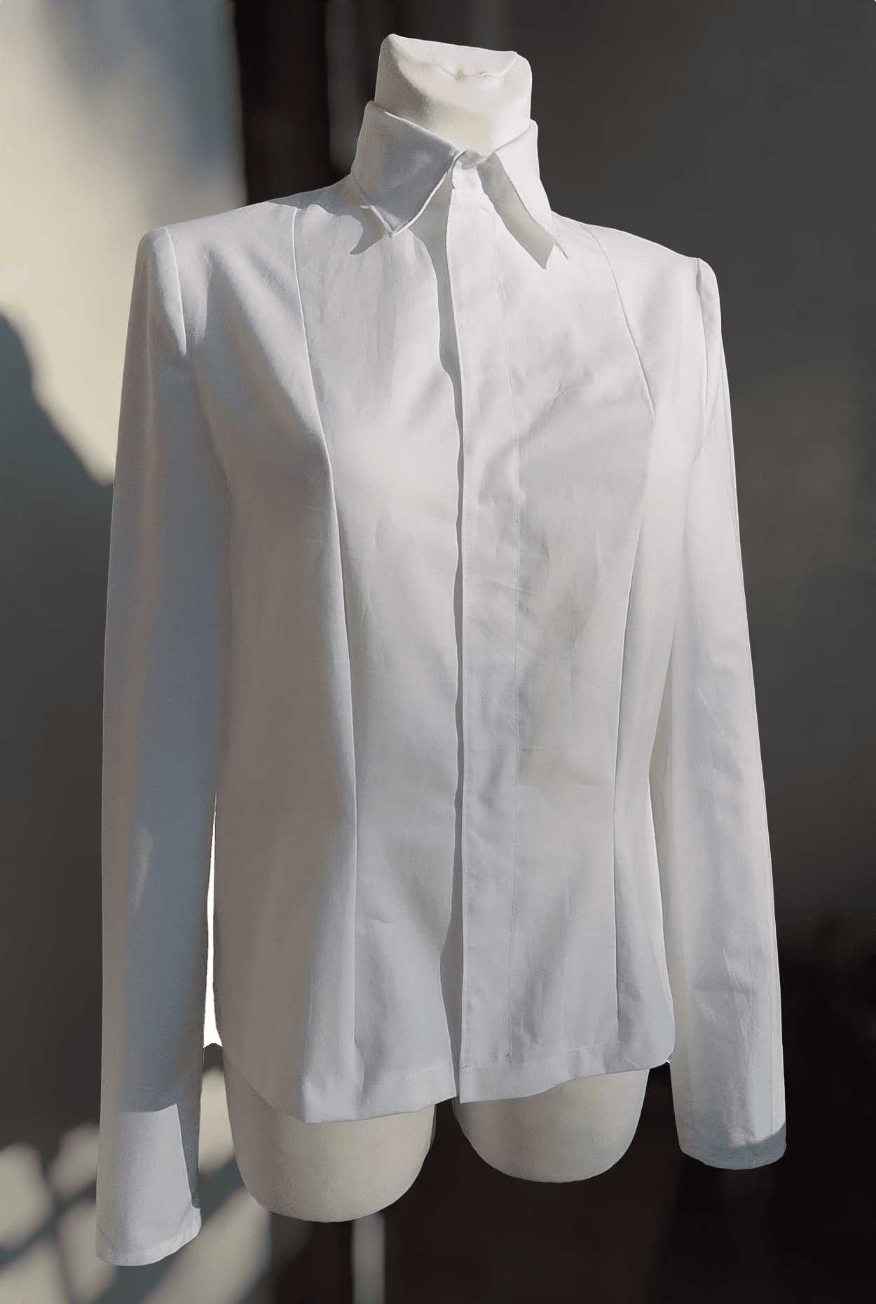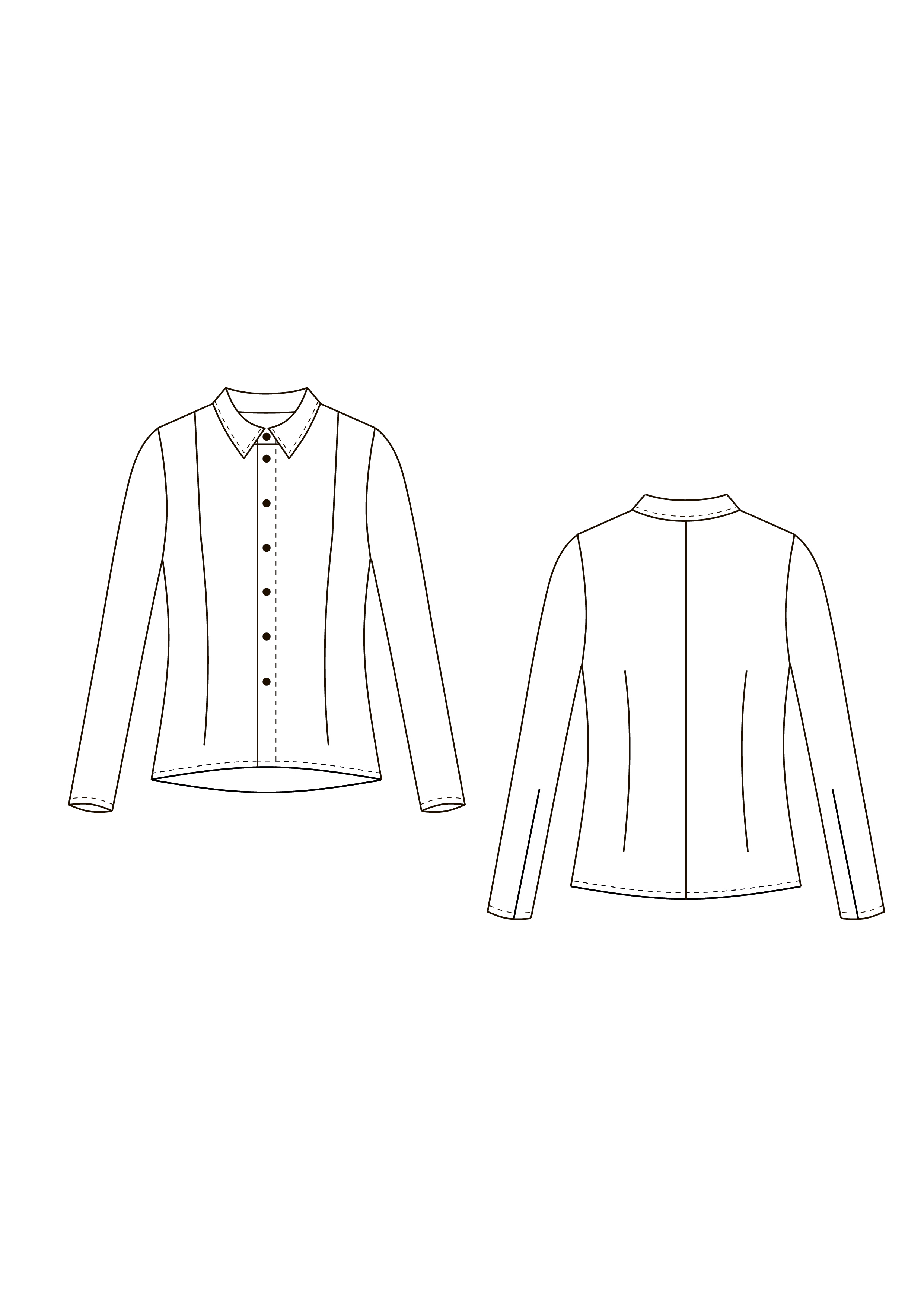 • składający się z dwóch części; • zapinany na guziki; • dwie zaszewki piersiowe; • dwie zaszewki na talii; • szwy boczne 1 cm; • szwy kołnierza i stójki 0,5 cm, szew przyszywania stójki do podkroju szyi 0,7 cm