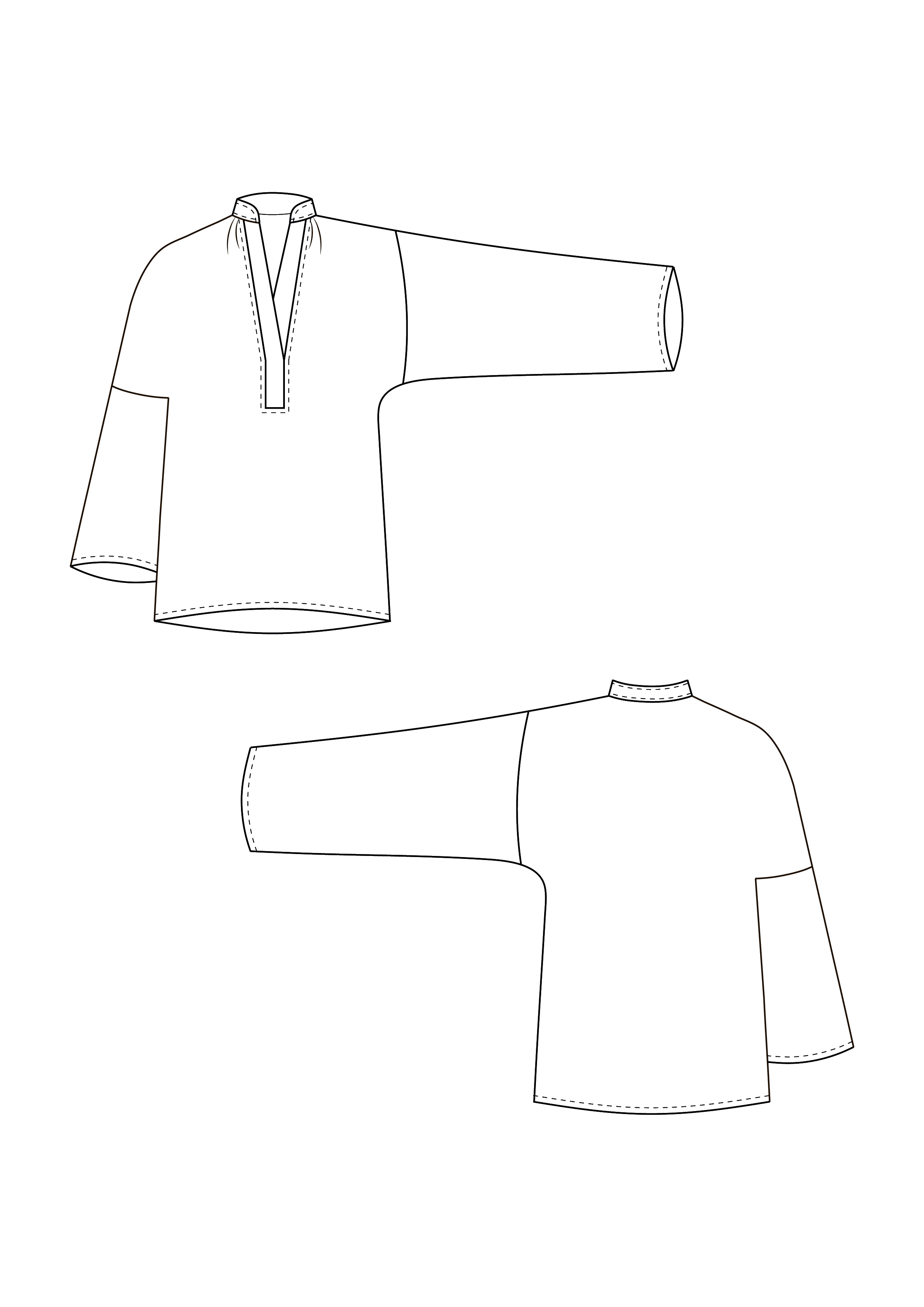• składający się z jednej części; • cztery fałdy na podkroju szyi; • zapięcie polo; • długość zapięcia 25 cm; • szwy boczne 1 cm; • szwy stójki 0,5 cm, szew przyszywania stójki do podkroju szyi 0,7 cm; • podwinięcie bluzy dołem 2 cm