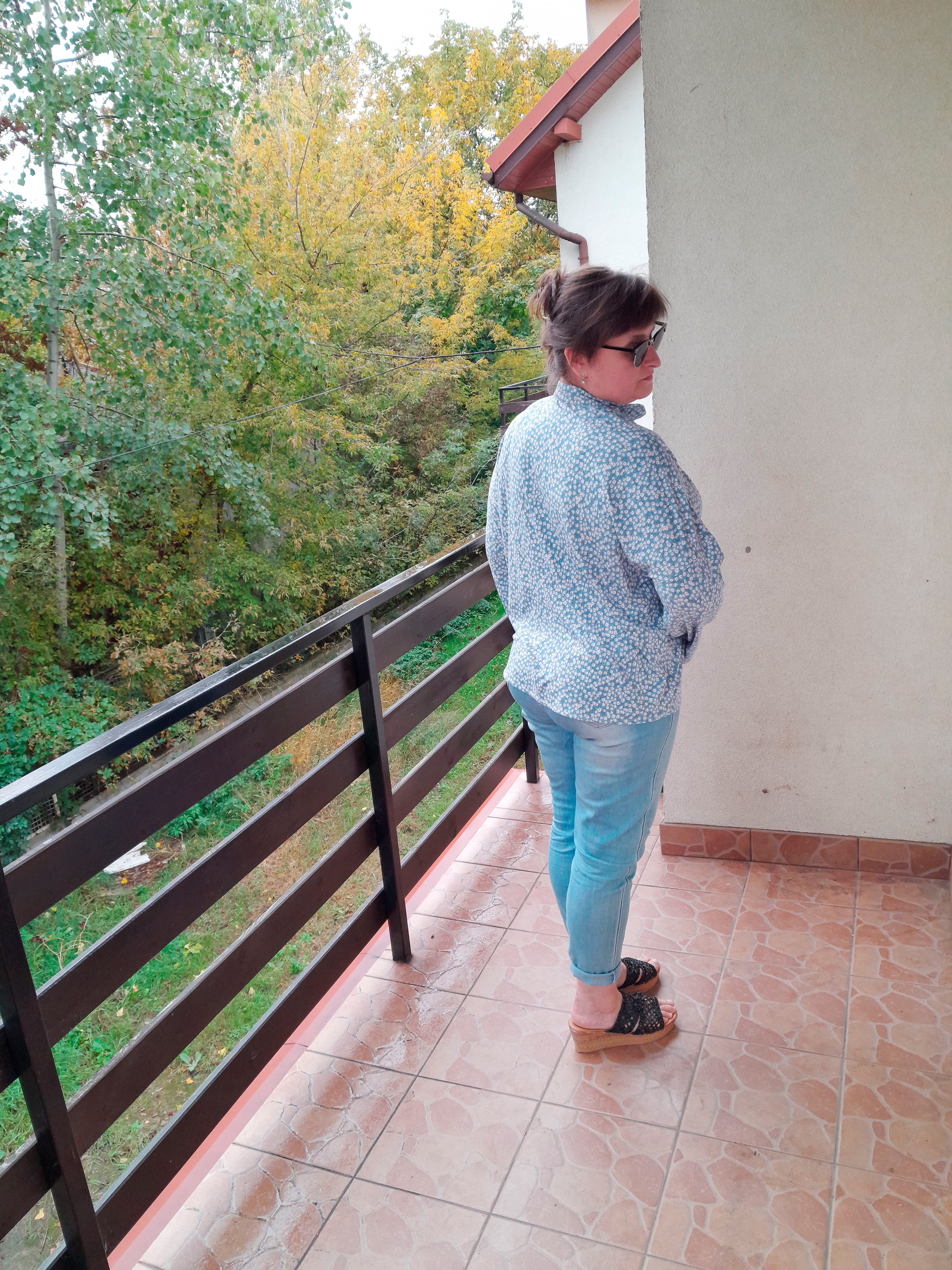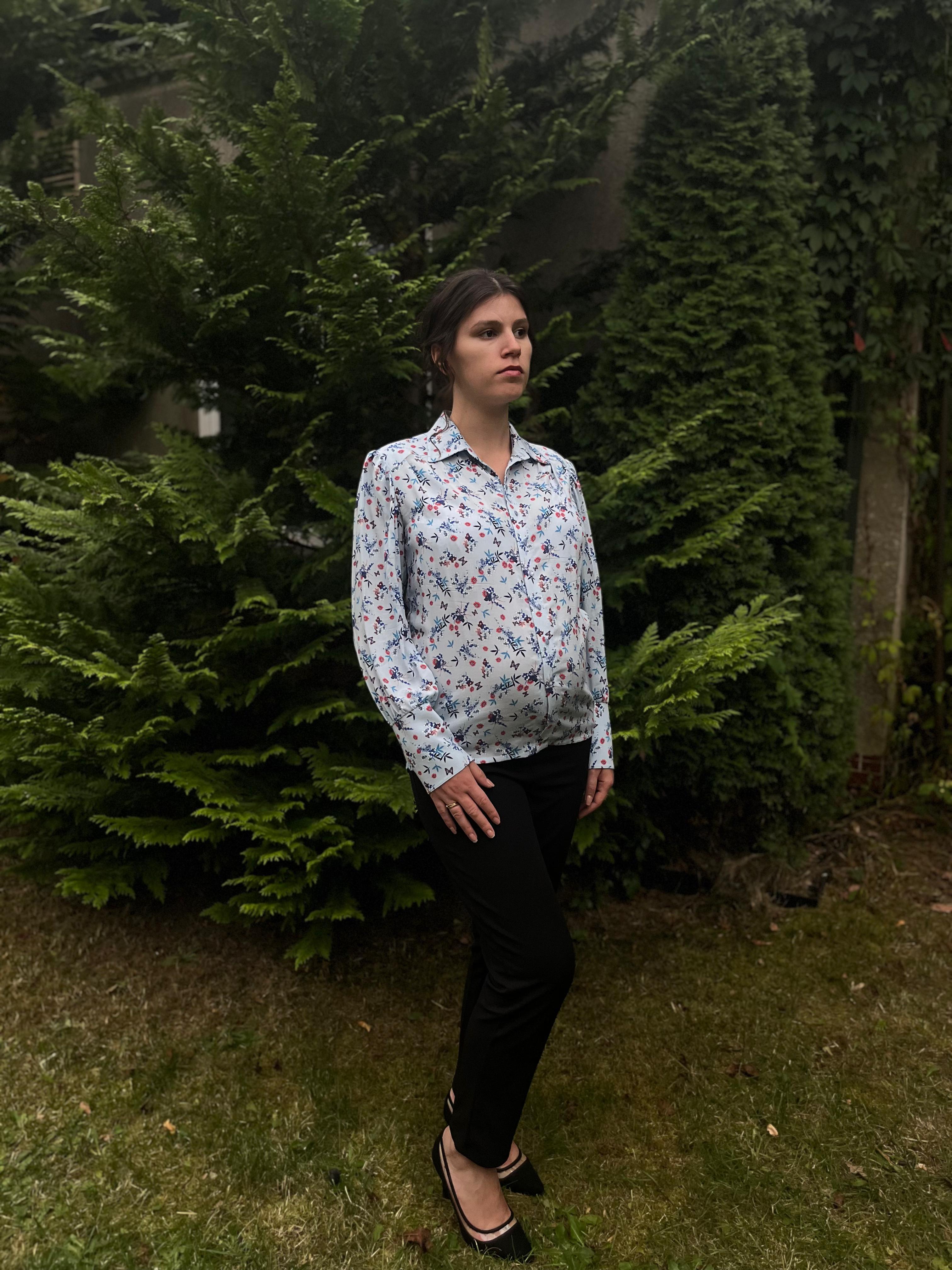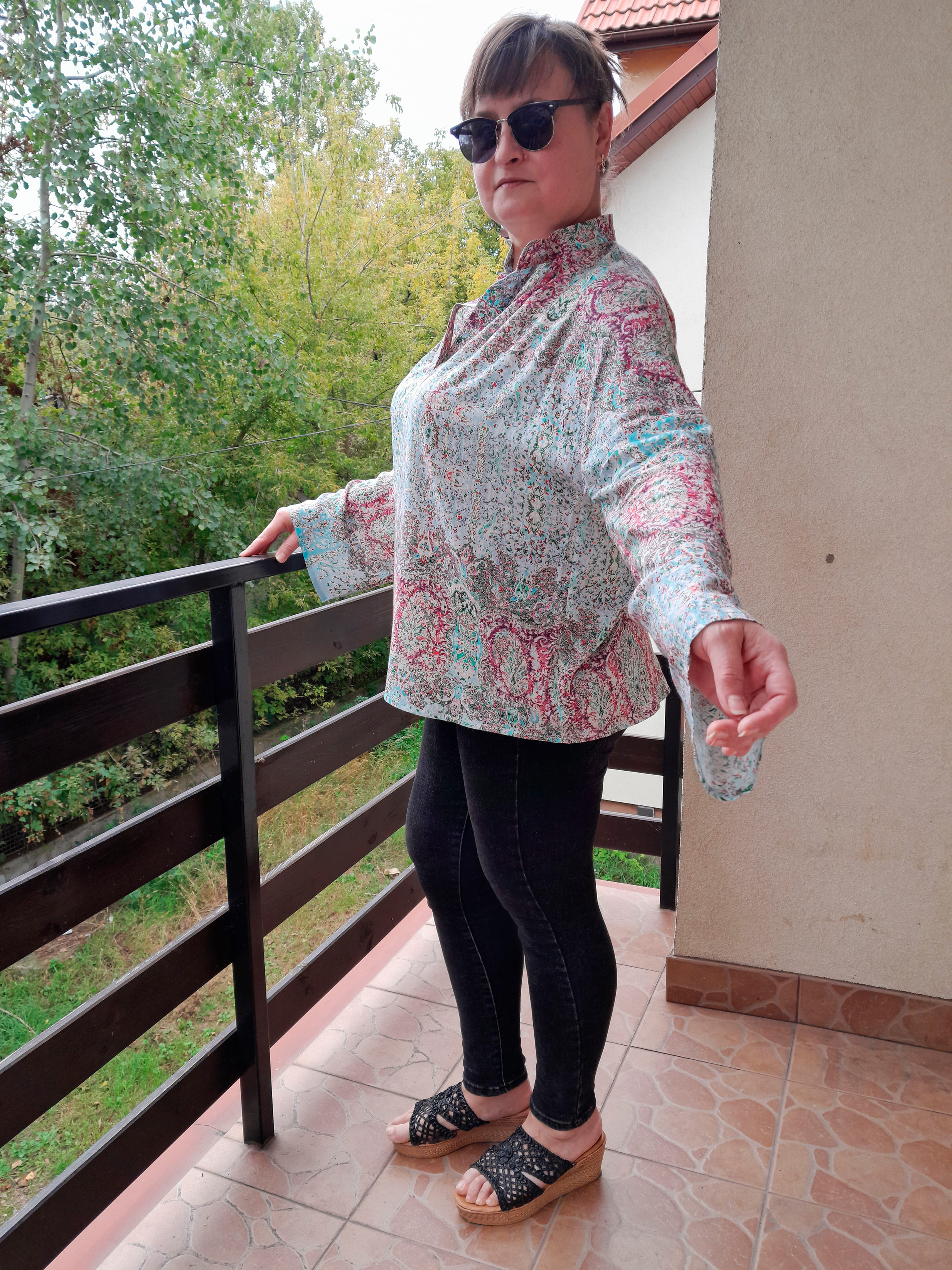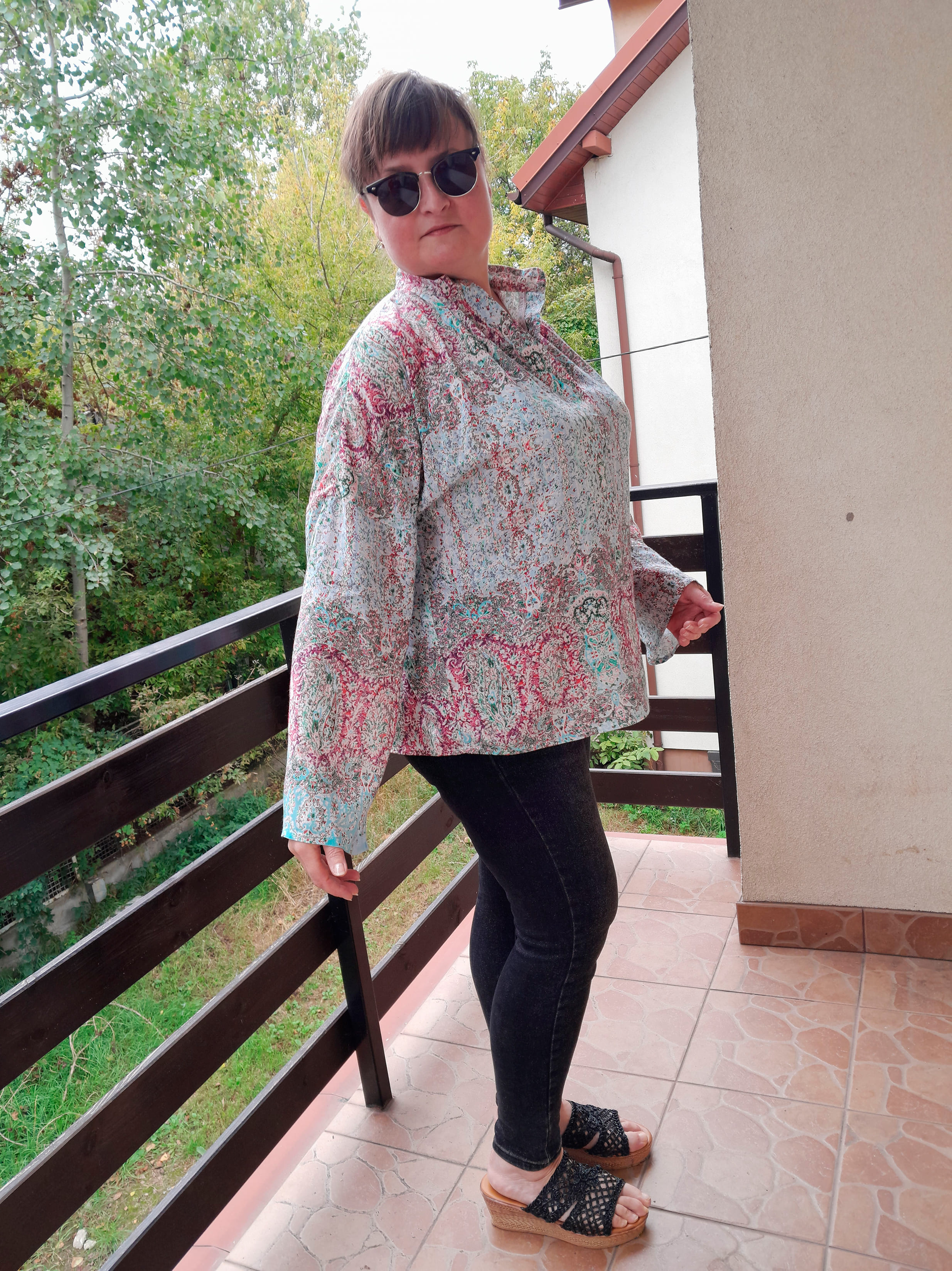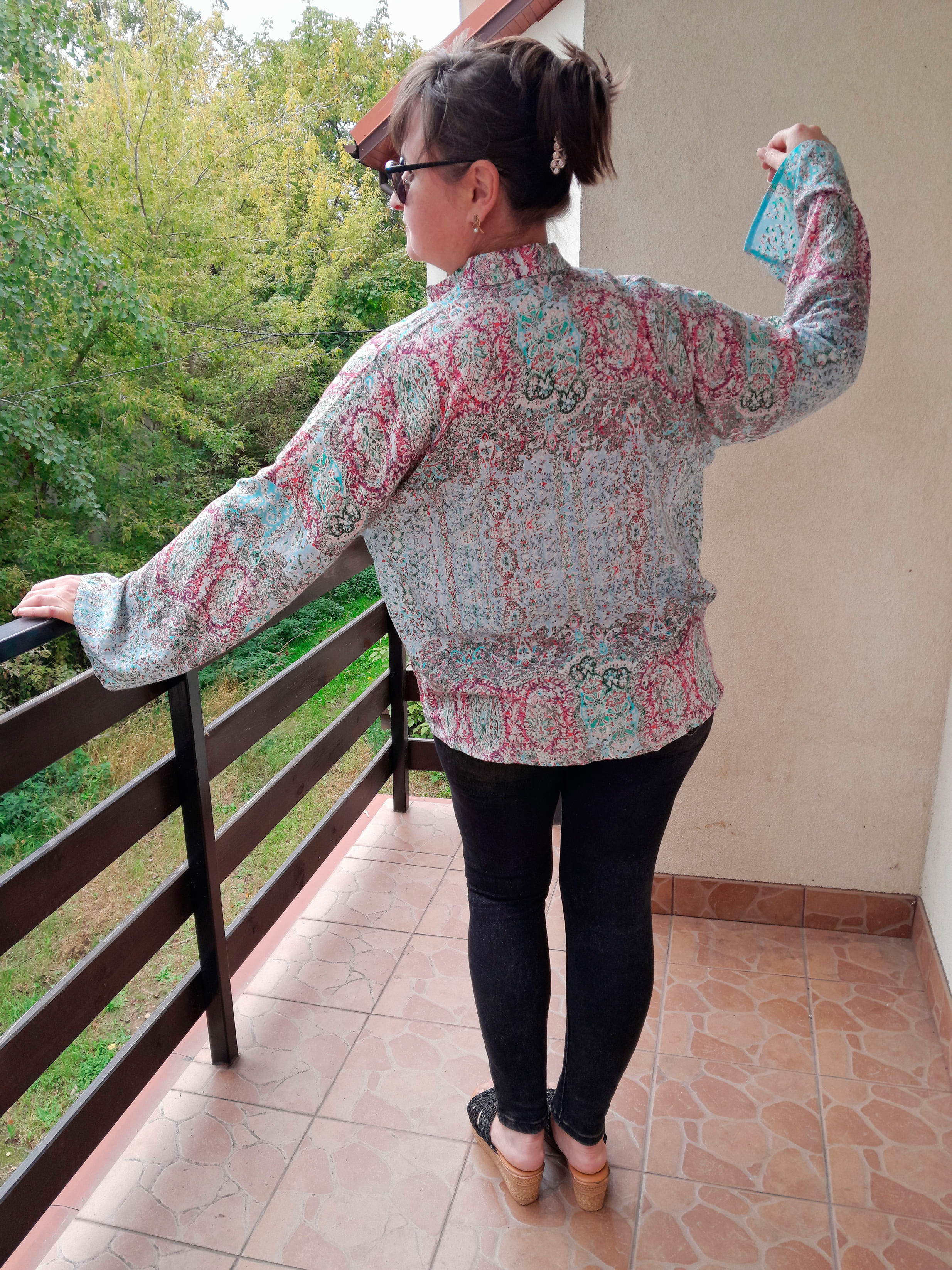 • składający się z dwóch części; • dwie zaszewki na talii; • podwinięcie bluzy dołem 2 cm