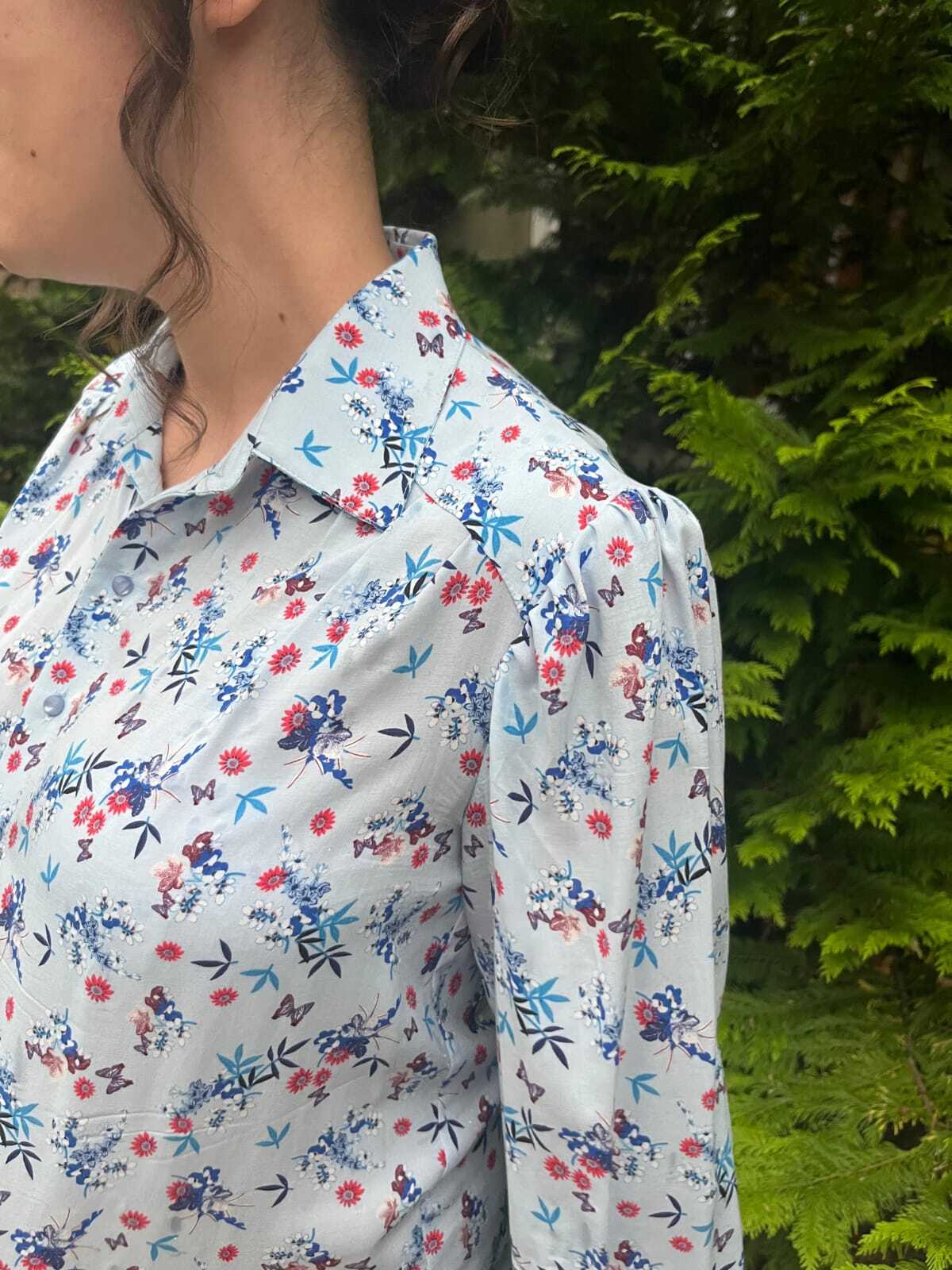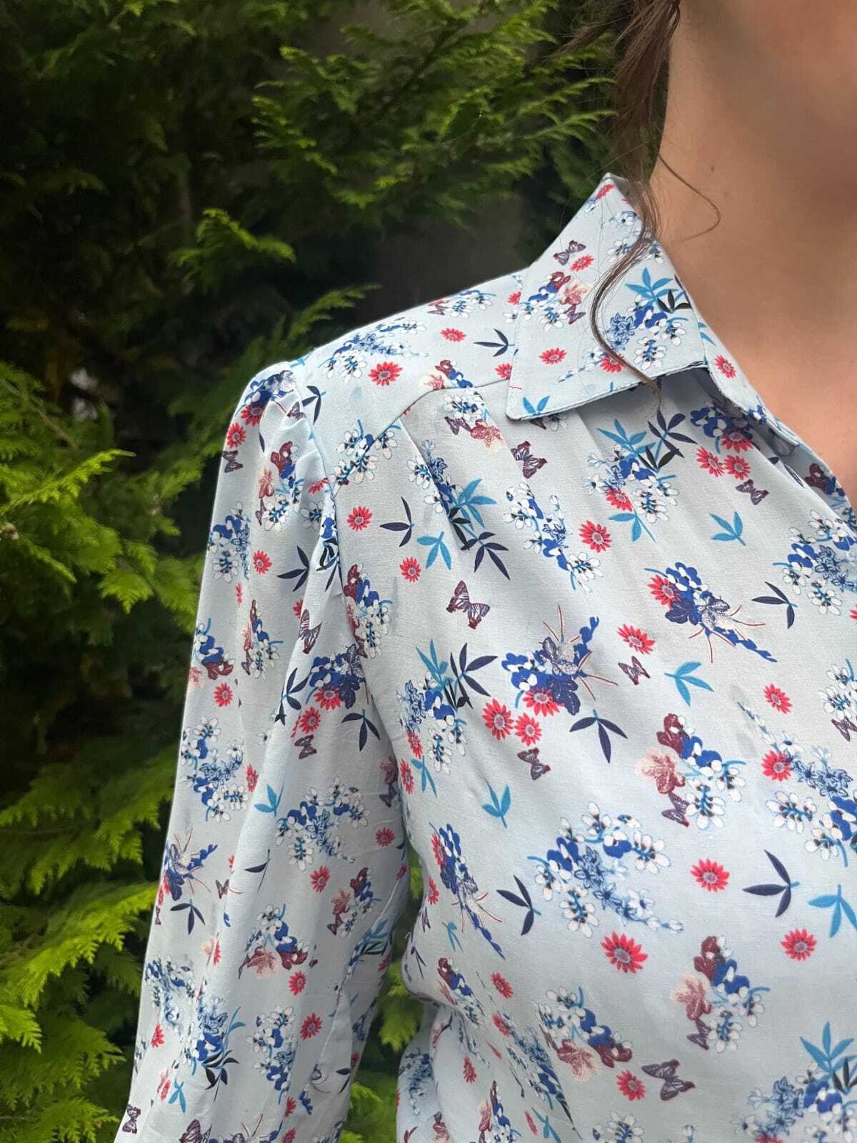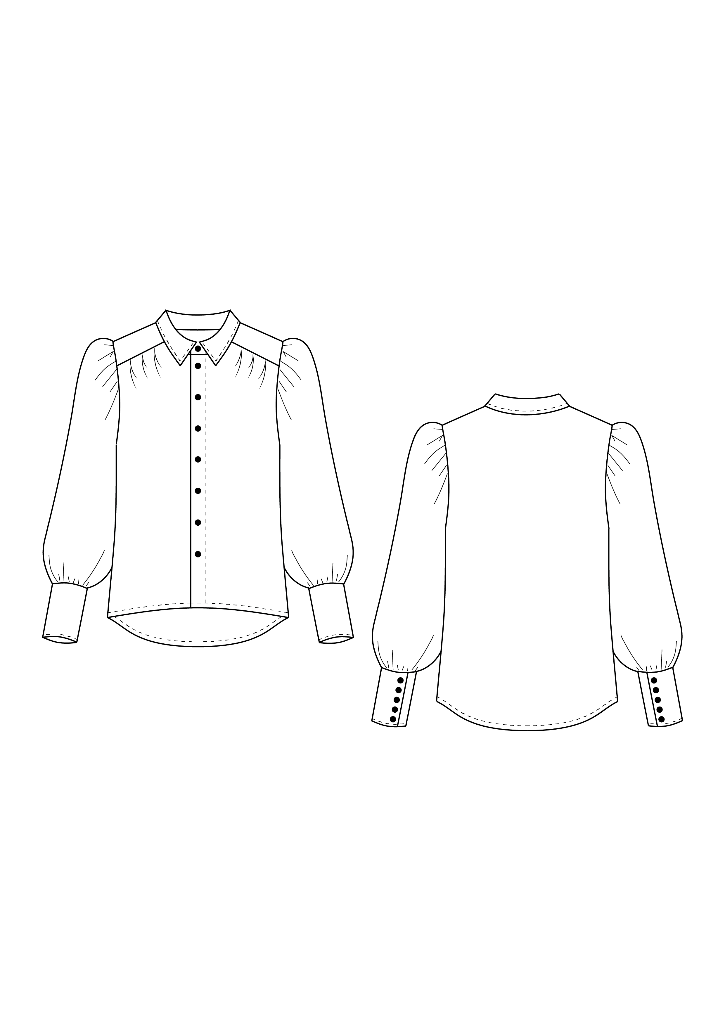 • krój prosty; • składający się z czterech części; • sześć fałd w szwie przyszywania karczka do przodu; • zapinany na guziki; • szwy boczne 1 cm; • szwy kołnierza i stójki 0,5 cm, szew przyszywania stójki do podkroju szyi 0,7 cm; • podwinięcie bluzy dołem 2 cm