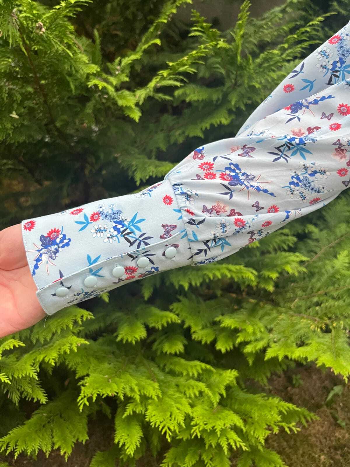 • rękawy długie, szerokie; • składające się z jednej części; • z marszczeniem w szwie przyszywania rękawów do wyrobu; • z marszczeniem w szwie przyszywania mankiet do rękawów; • rękawy mą jeden szew (szew 1 cm); • szew przyszywania rękawów do bluzy 1 cm; • mankiety do rękawów (szerokość 13 cm), każda jest zapinana na 5 guzików; • szwy zszywania mankiet 0,5 cm, szew przyszywania mankiet do rękawów 1 cm