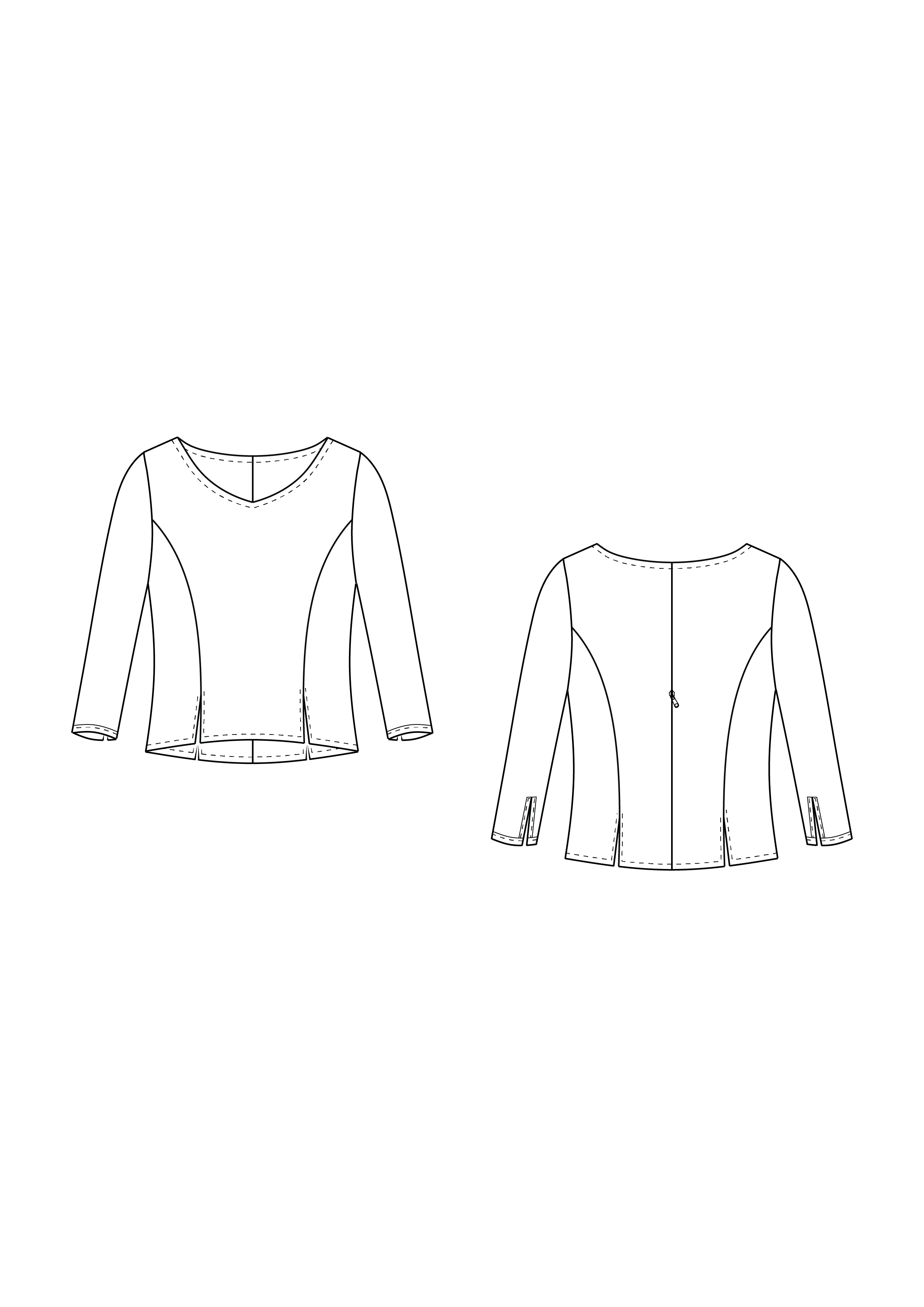 • składa się z czterуch części; • w szwach reliefowych wykonano rozporki o długości 7 cm; • dekolt tyłu wykończony obłożeniem; • szerokość obłożenia 3 cm; • w środkowym szwie wszyty kryty, rozdzielczy zamek błyskawiczny, rozpoczynający się na wysokości 20,5 cm od góry bluzki; • podwinięcie bluzy dołem 1 cm