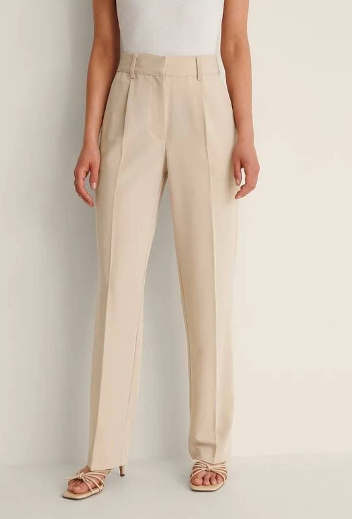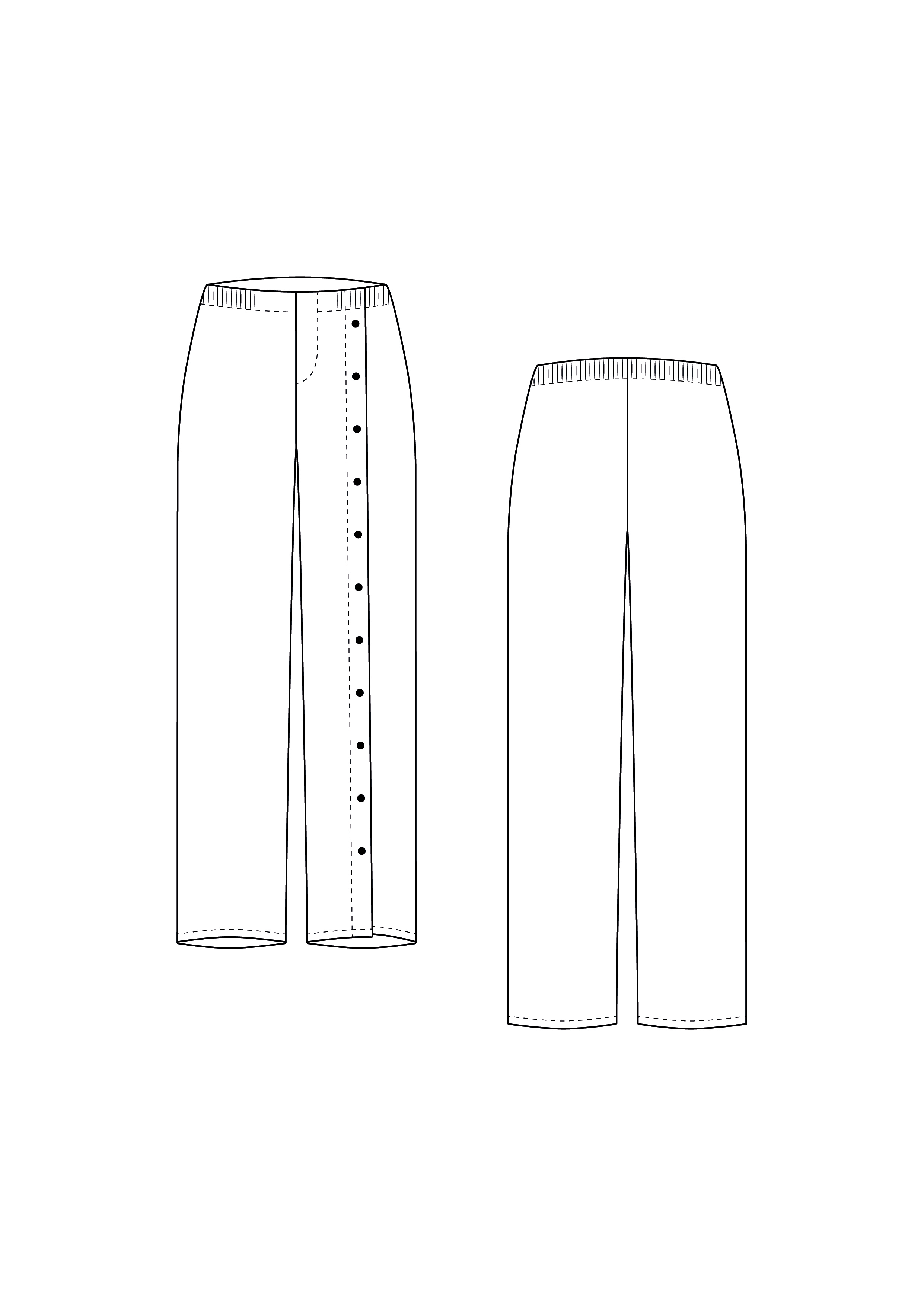 • spodnie symetryczne o kroju prostym; • składający się z dwóch części; • pasek wewnętrzny (szerokość 5 cm); • na pasku naszyta guma; • szwy detali paska 0,7 cm, szew przyszywania paska do spodni 1 cm • podwinięcie spodni dołem 3 cm