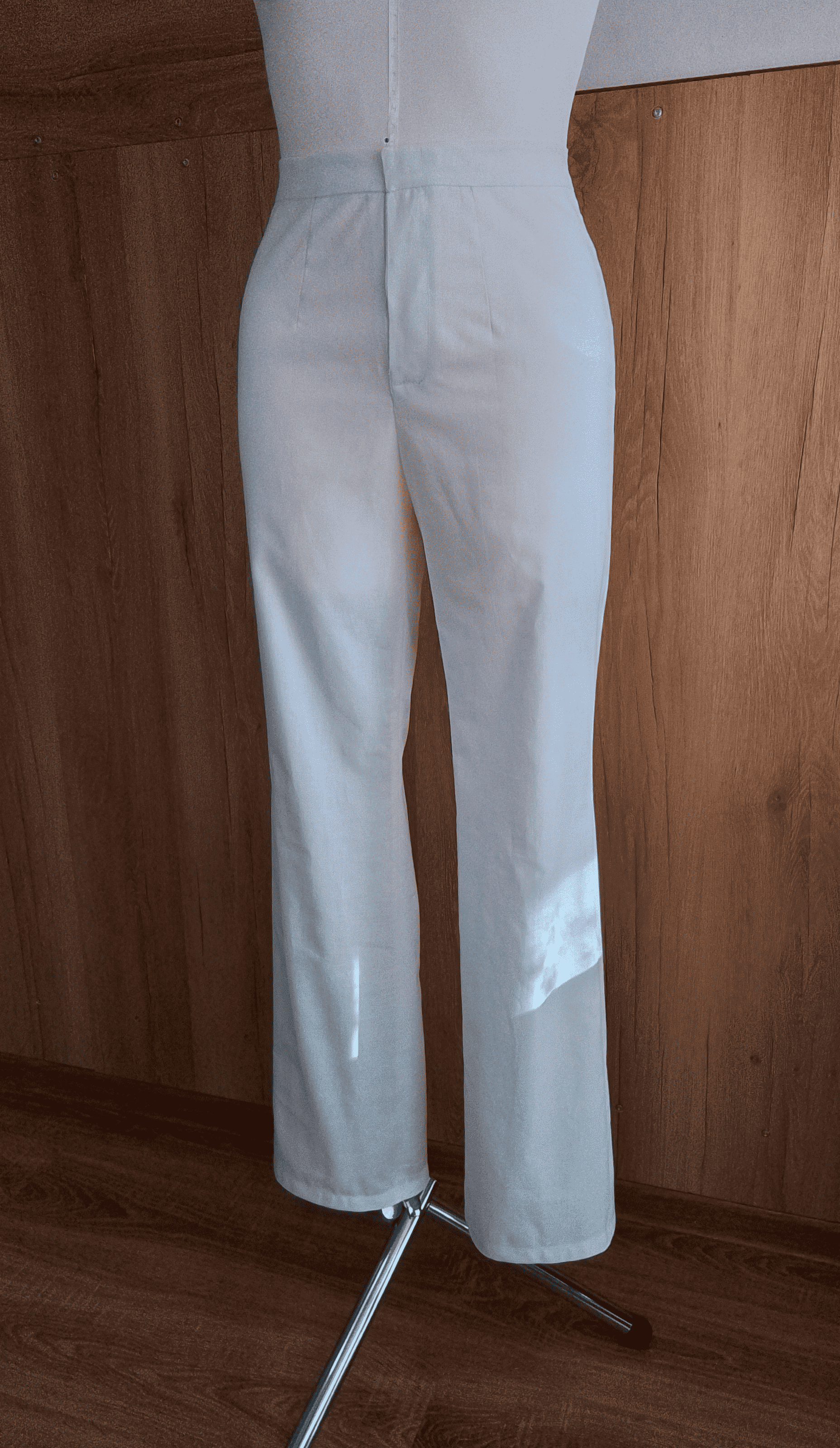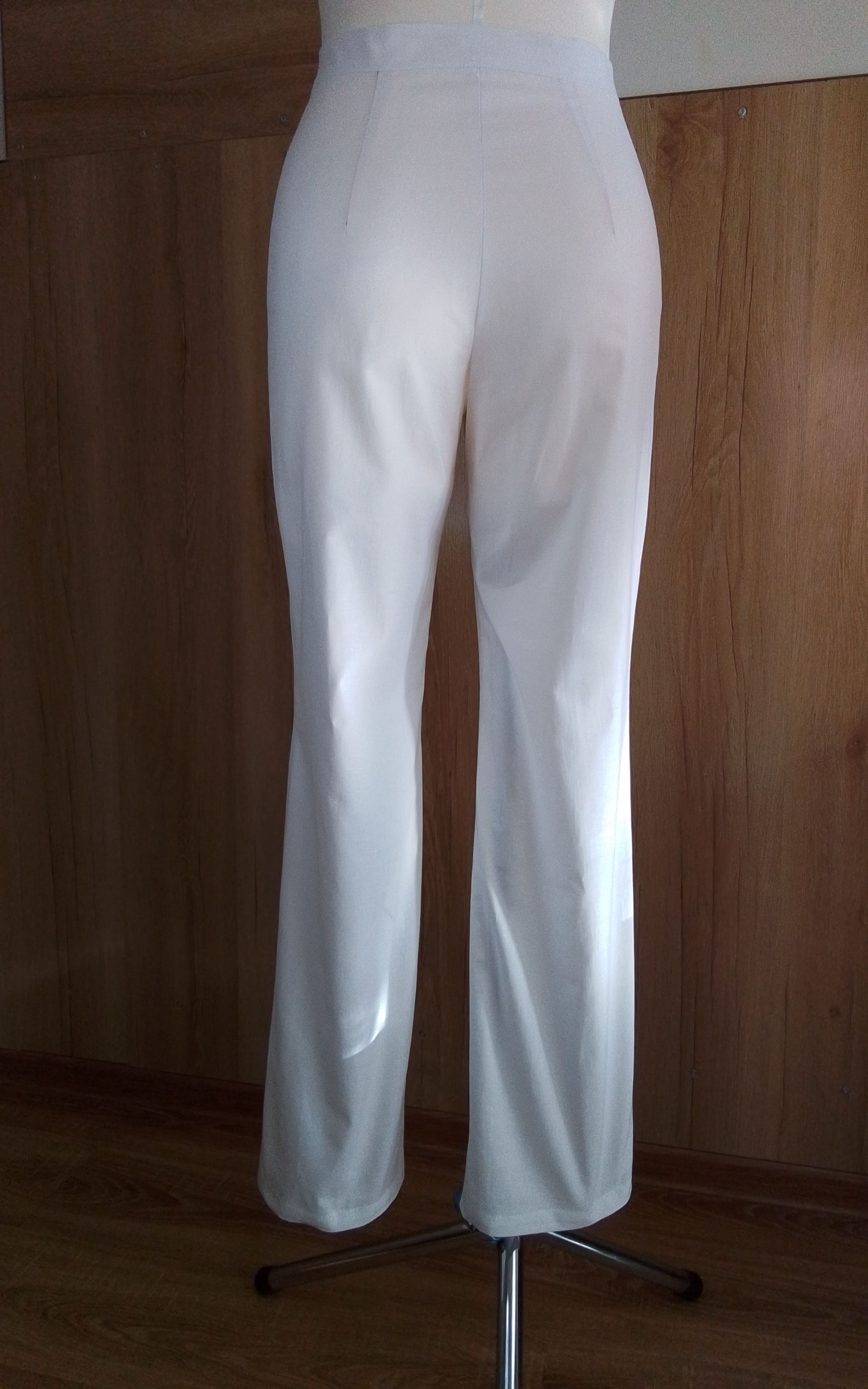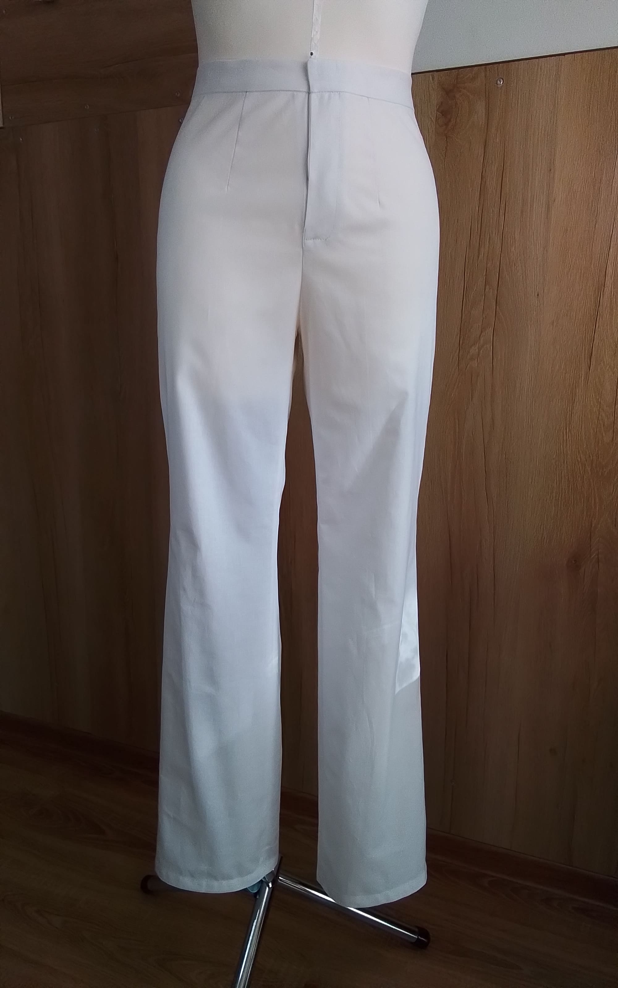 • spodnie asymetryczne o kroju prostym; • składający się z trzech części; • na lewej nogawce wykonane zapięcie zapinane na 11 guzików (średnica 1,5 cm); • szwy boczne, wewnętrzne i siedzeniowe 1 cm; • z przodu wykonany rozporek zapinany na zamek błyskawiczny; • pasek wewnętrzny (szerokość 5 cm); • na pasku naszyta guma (niedoszywana do szwa siedzeniowego na 7 cm); • szwy detali paska 0,7 cm, szew przyszywania paska do spodni 1 cm; • podwinięcie spodni dołem 3 cm