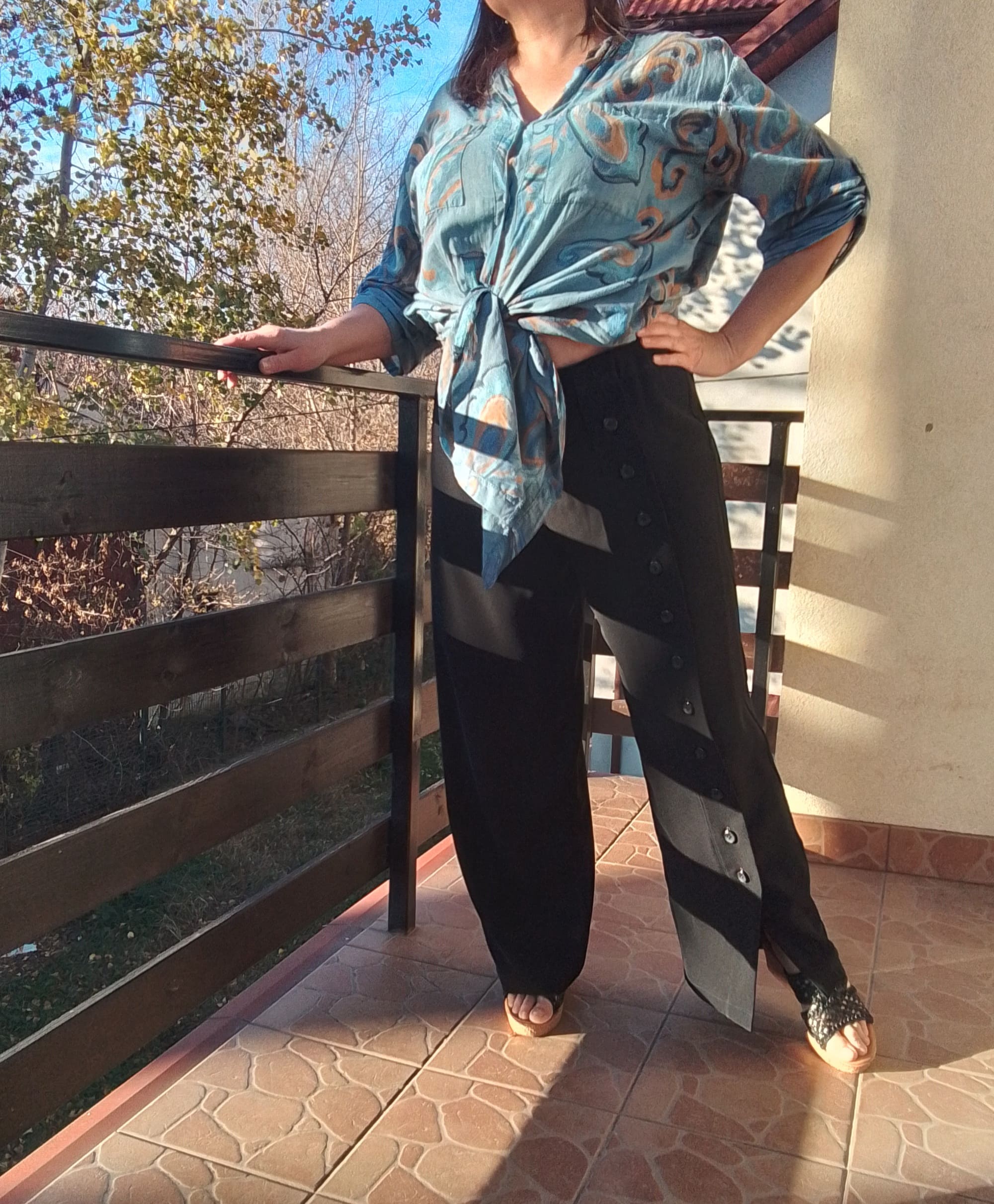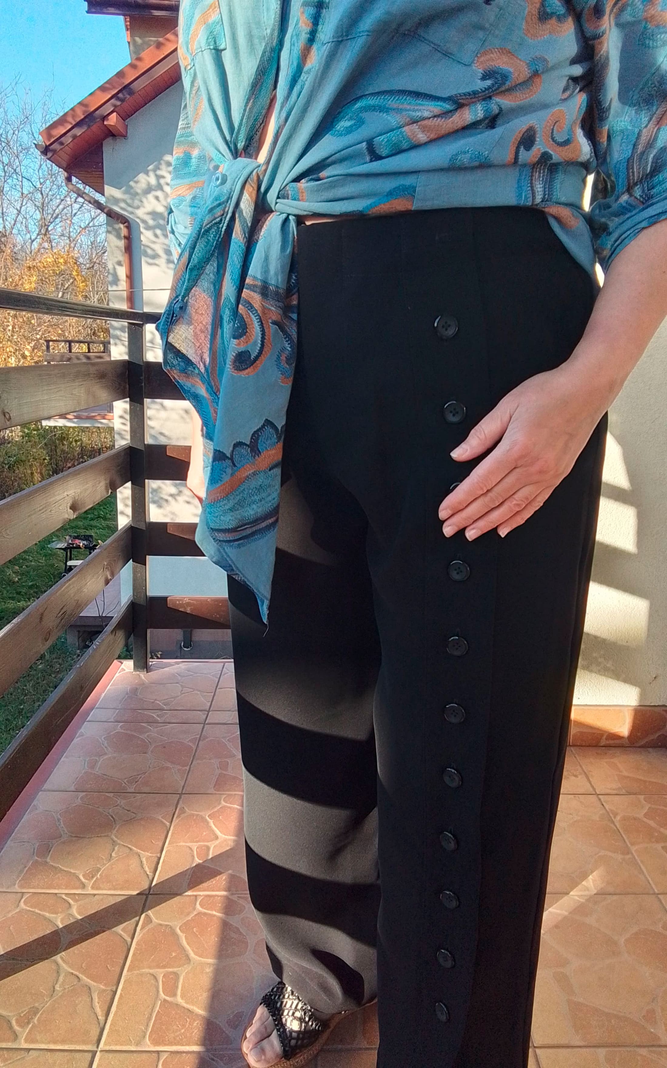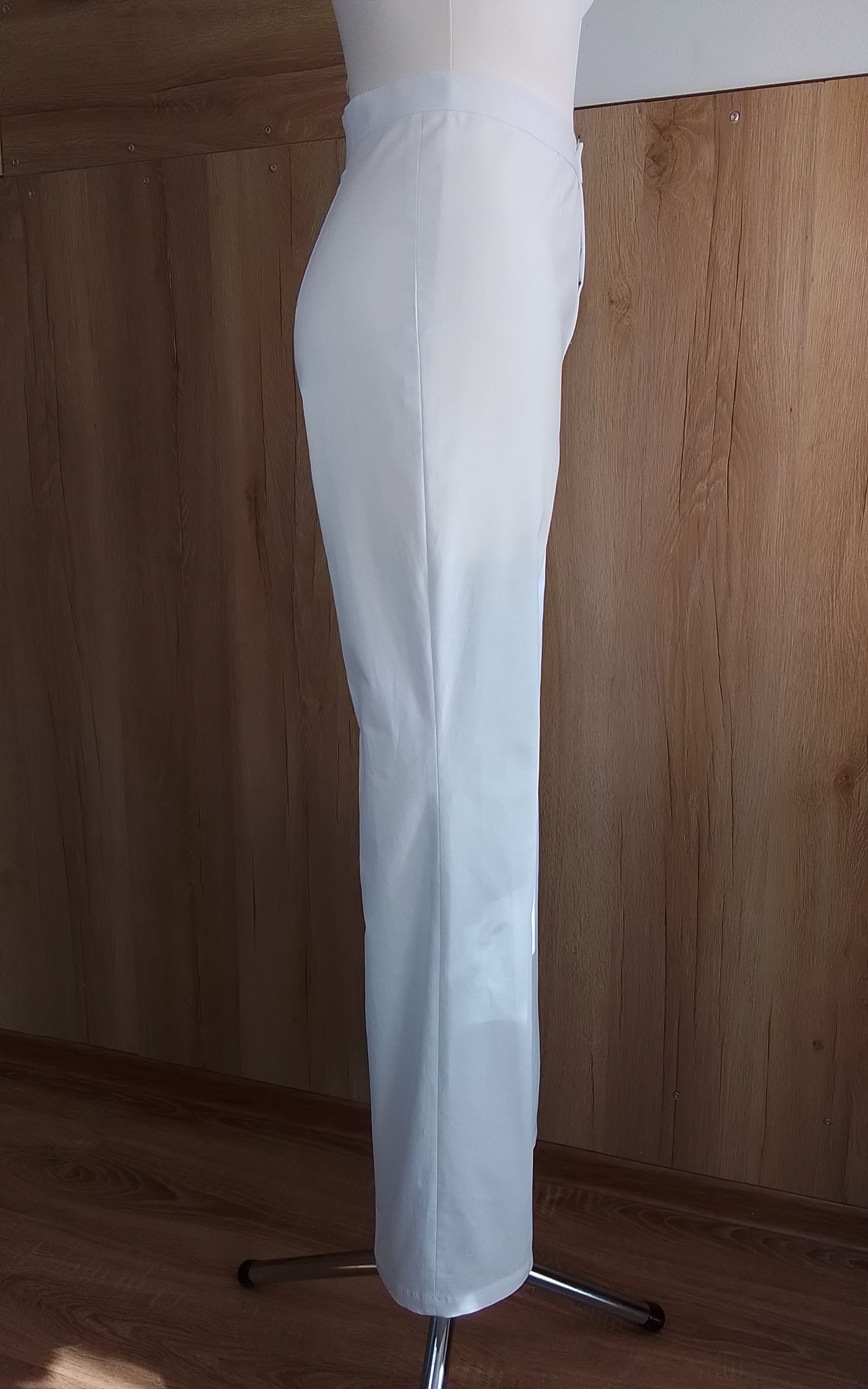• spodnie asymetryczne o kroju prostym; • składający się z trzech części; • na lewej nogawce wykonane zapięcie zapinane na 11 guzików (średnica 1,5 cm); • szwy boczne, wewnętrzne i siedzeniowe 1 cm; • z przodu wykonany rozporek zapinany na zamek błyskawiczny; • pasek wewnętrzny (szerokość 5 cm); • na pasku naszyta guma (niedoszywana do szwa siedzeniowego na 7 cm); • szwy detali paska 0,7 cm, szew przyszywania paska do spodni 1 cm; • podwinięcie spodni dołem 3 cm