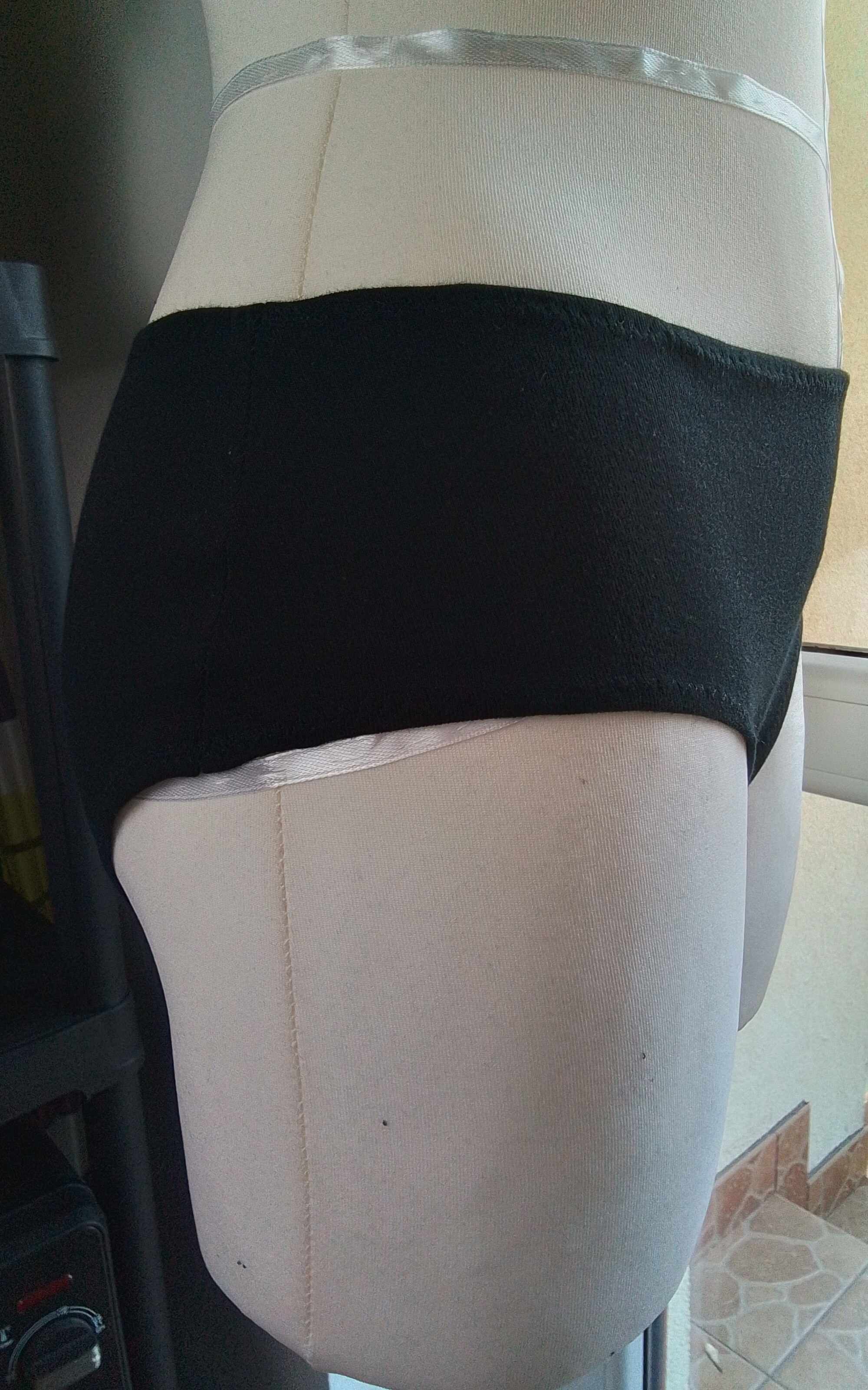 • prosty składający się z jednej części; • dodatki na szwy 0,7 cm; • na linii talii i dołu naszyta guma bieliźniana