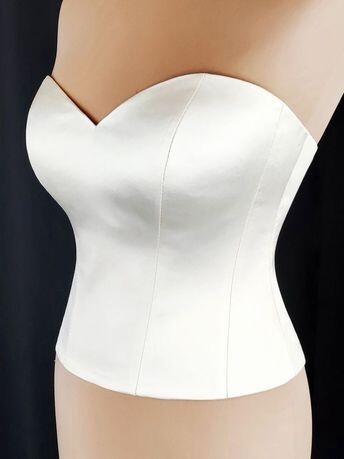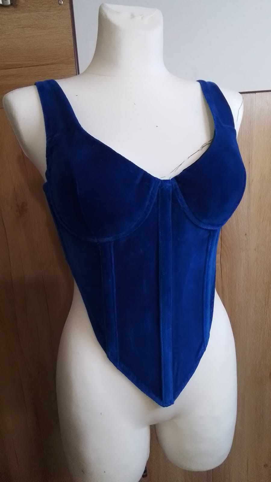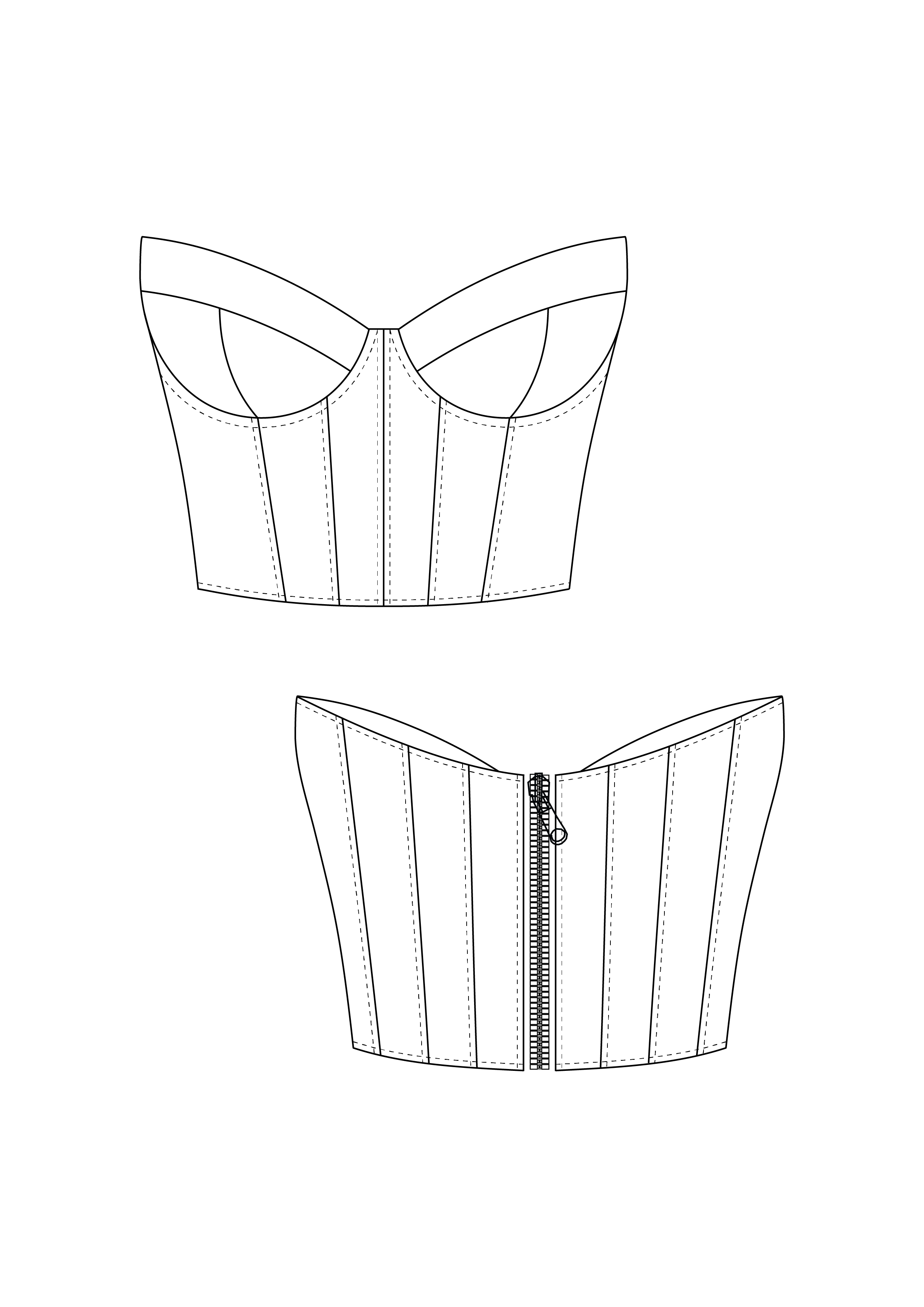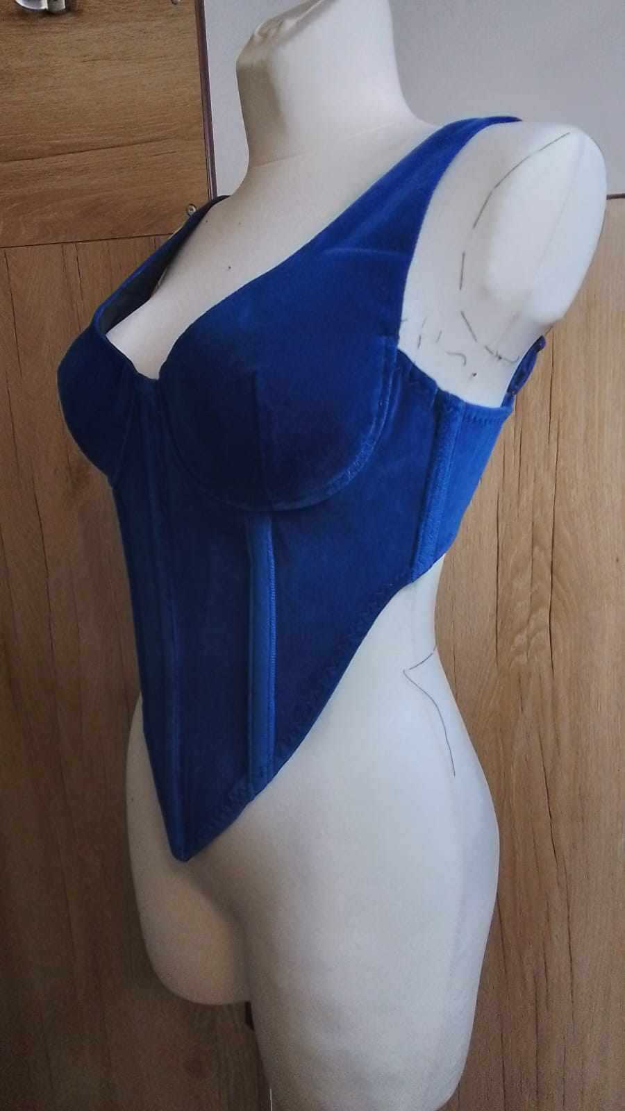 • miseczki gorsetu składające się z trzech części; • dodatki na szwy miseczek 1 cm; • gorset składający z czternastu części; • dodatki na szwy wszystkich części gorsetu 1,3 cm; • na szwie przyszywania gorsetu do miseczek naszyte tuneli gorseciarskie z metalowymi fiszbinami; • na szwach zszywania wszystkich części gorsetu wszyta taśma regiline; • gorset zapinany na zamek błyskawiczny