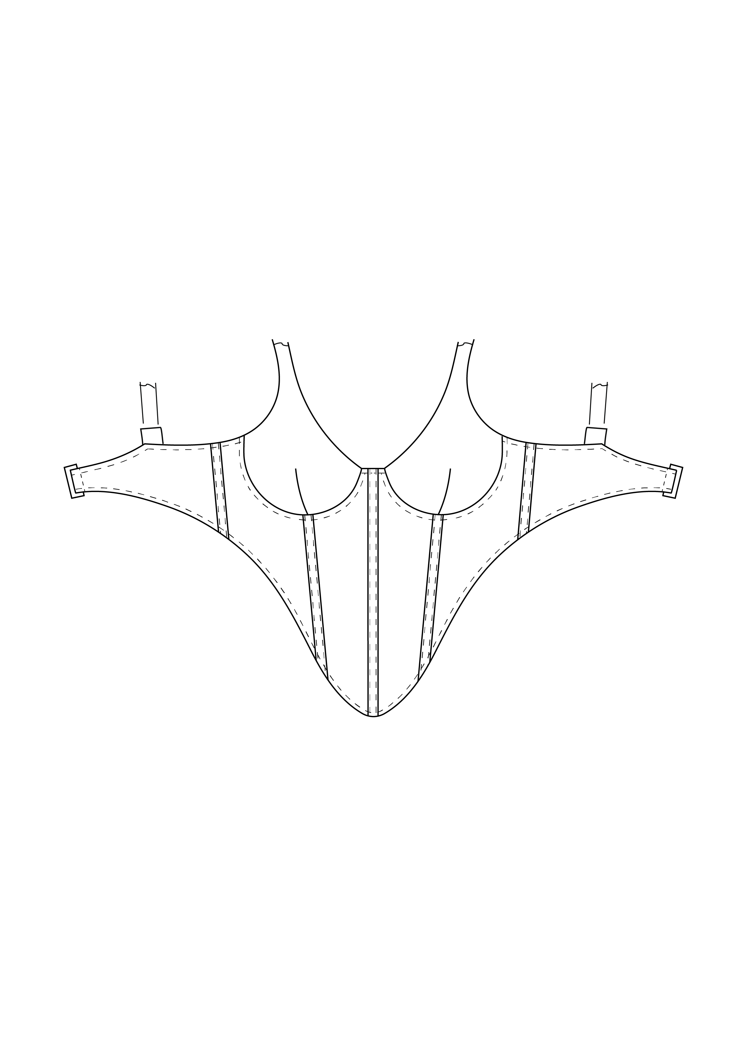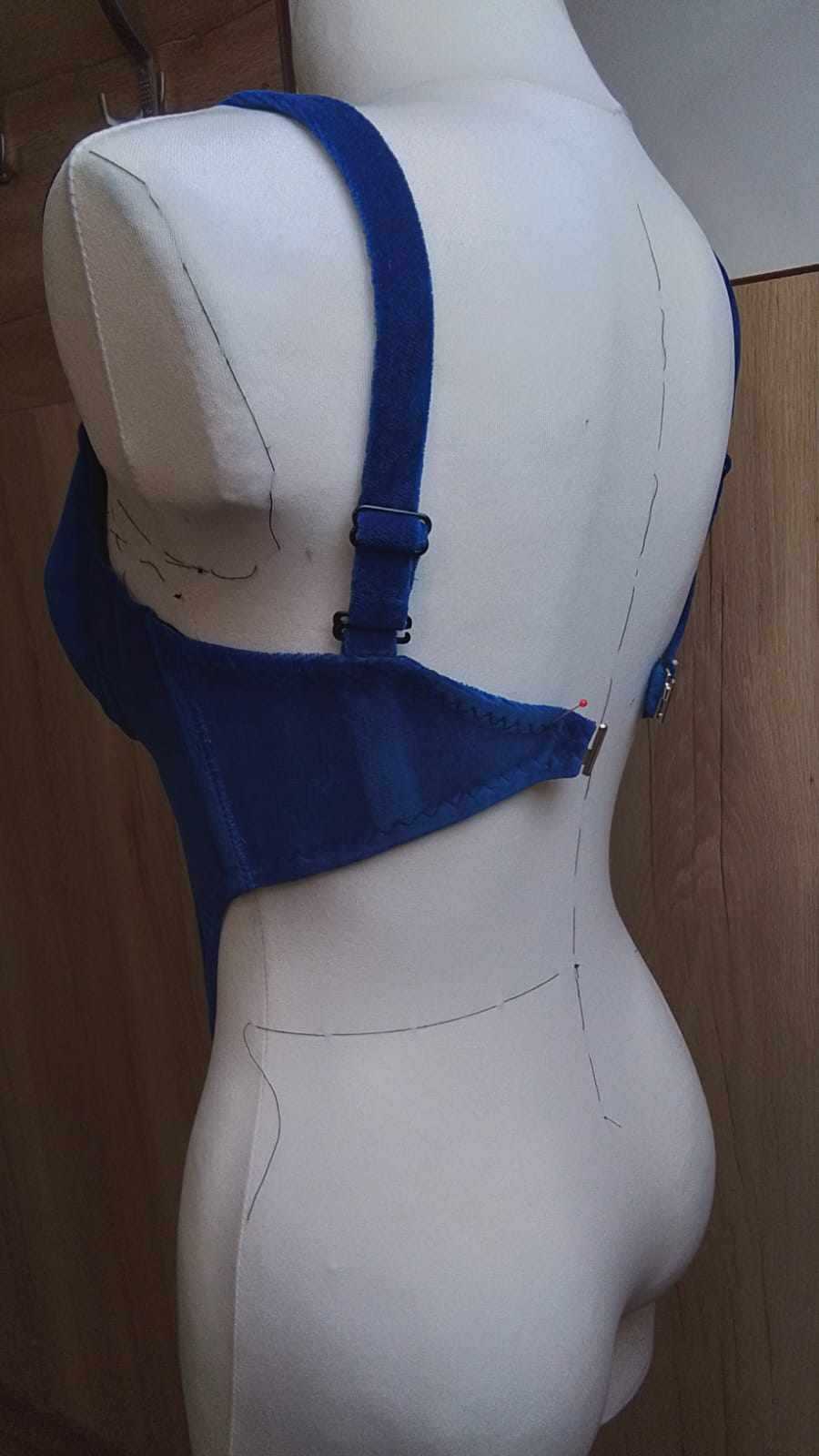 • miseczki gorsetu składają się z jednej części, ciętej w całości razem z ramiączkami barkowymi; • dodatki na szwy miseczek mają 1 cm; • gorset składa się z sześciu części; • dodatki na szwy wszystkich części gorsetu mają 1,3 cm; • na szwie przyszywania gorsetu do miseczek naszyte tuneli gorseciarskie z metalowymi fiszbinami; • na szwach zszywania wszystkich części gorsetu z prawej strony naszyta taśma