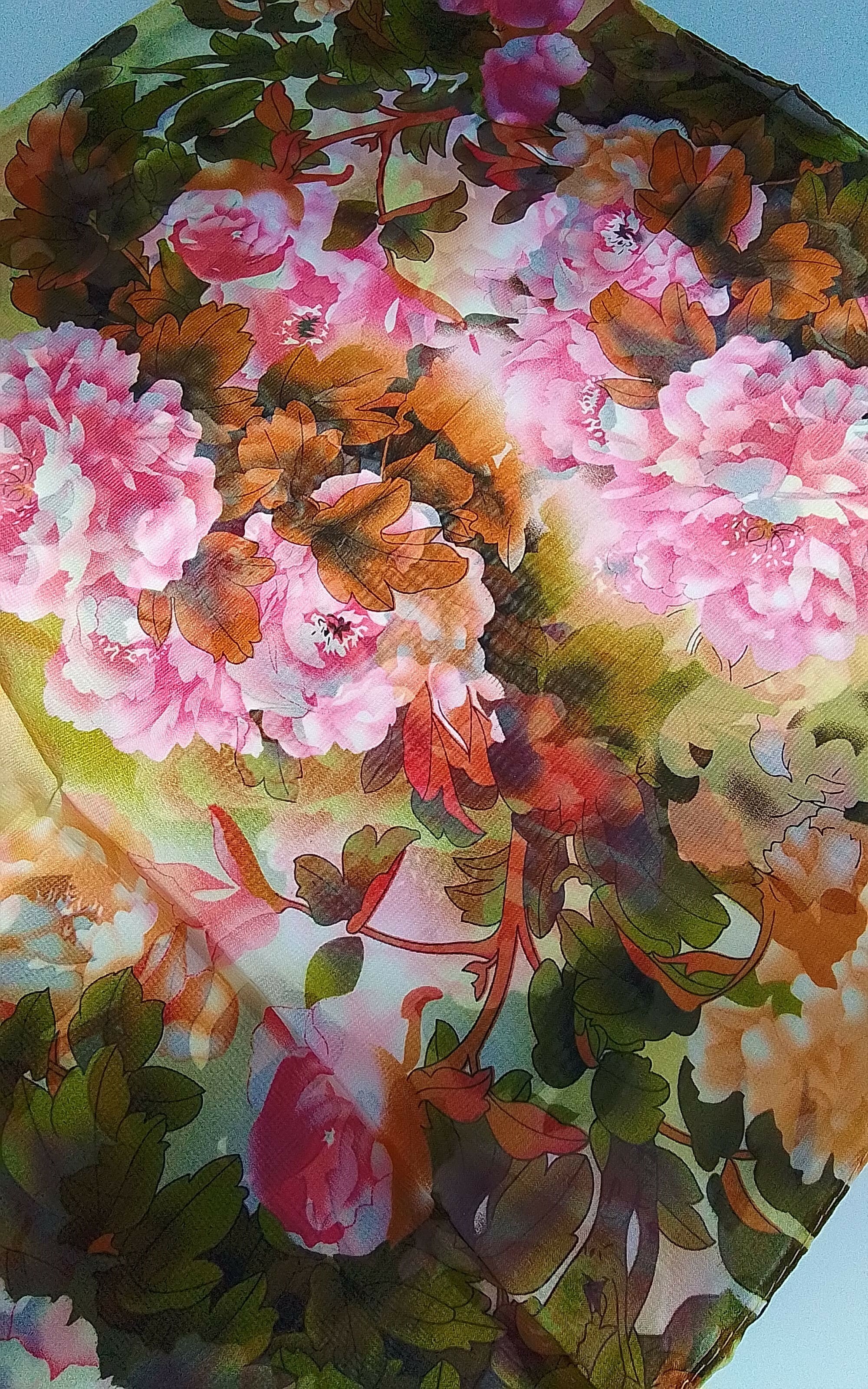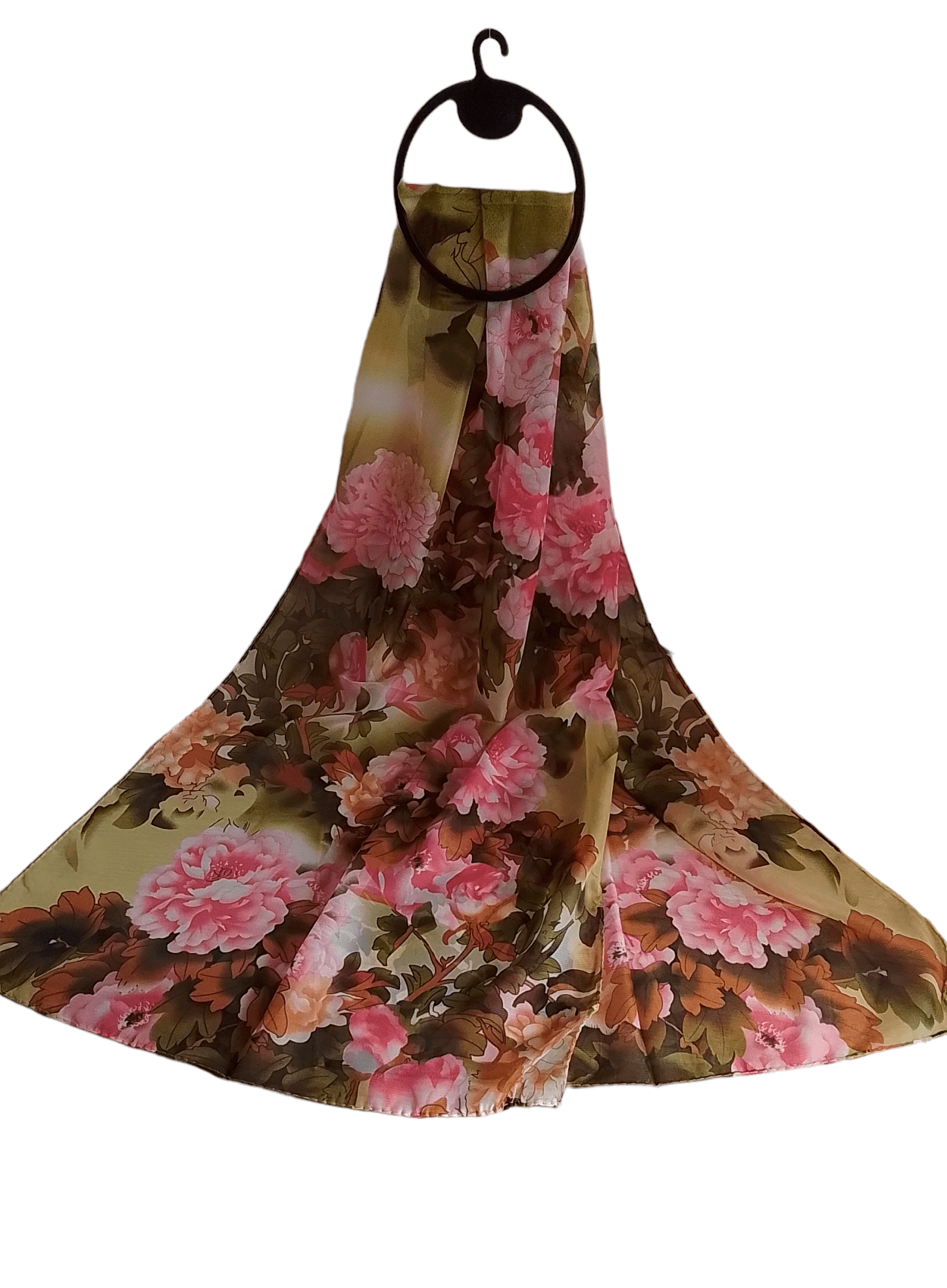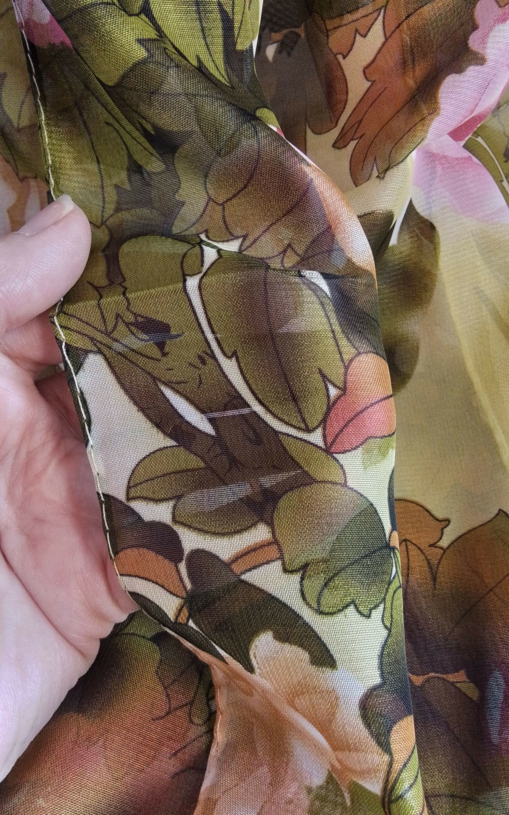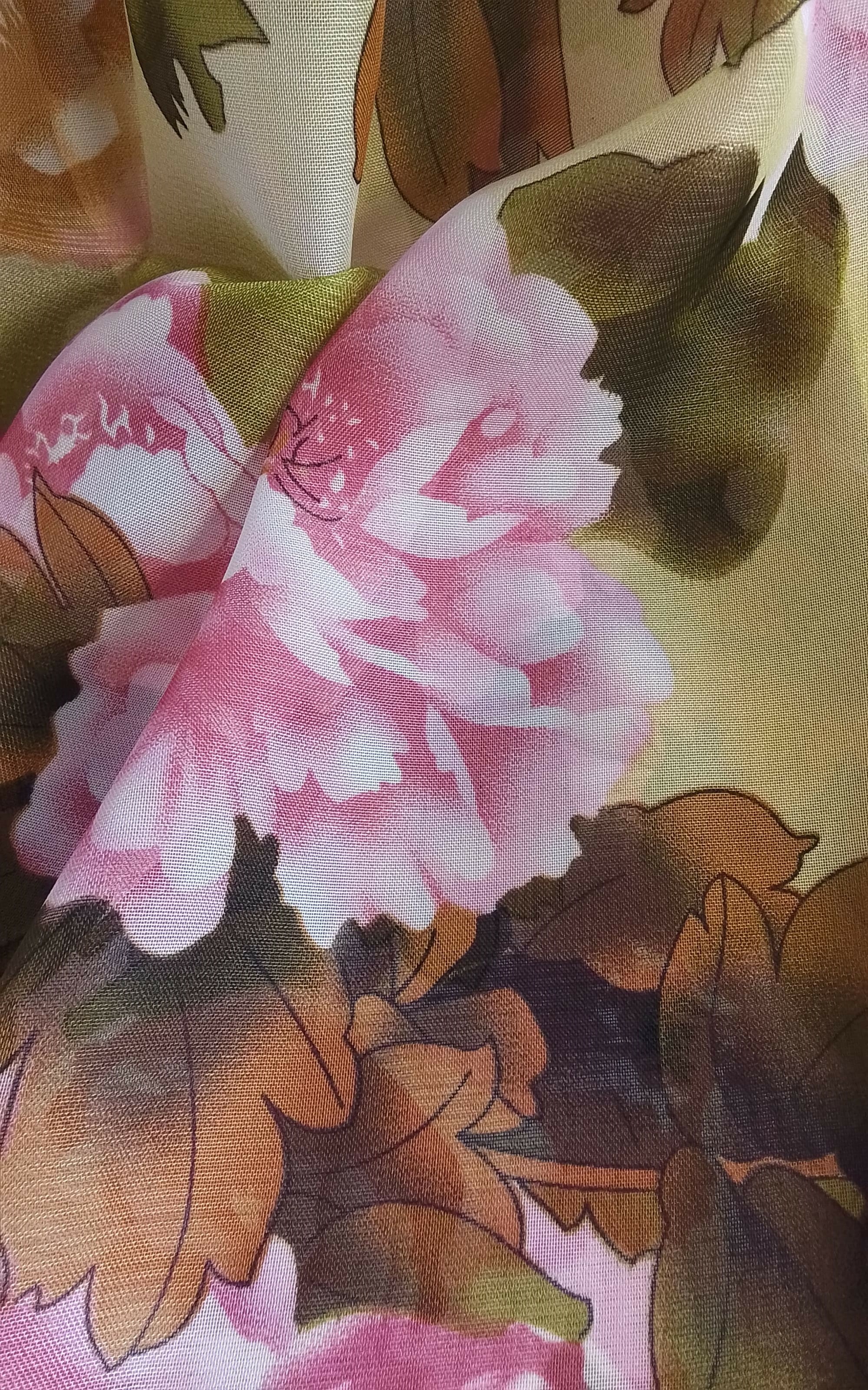 Szal cienki w kwiatki różowo-oliwkowy.