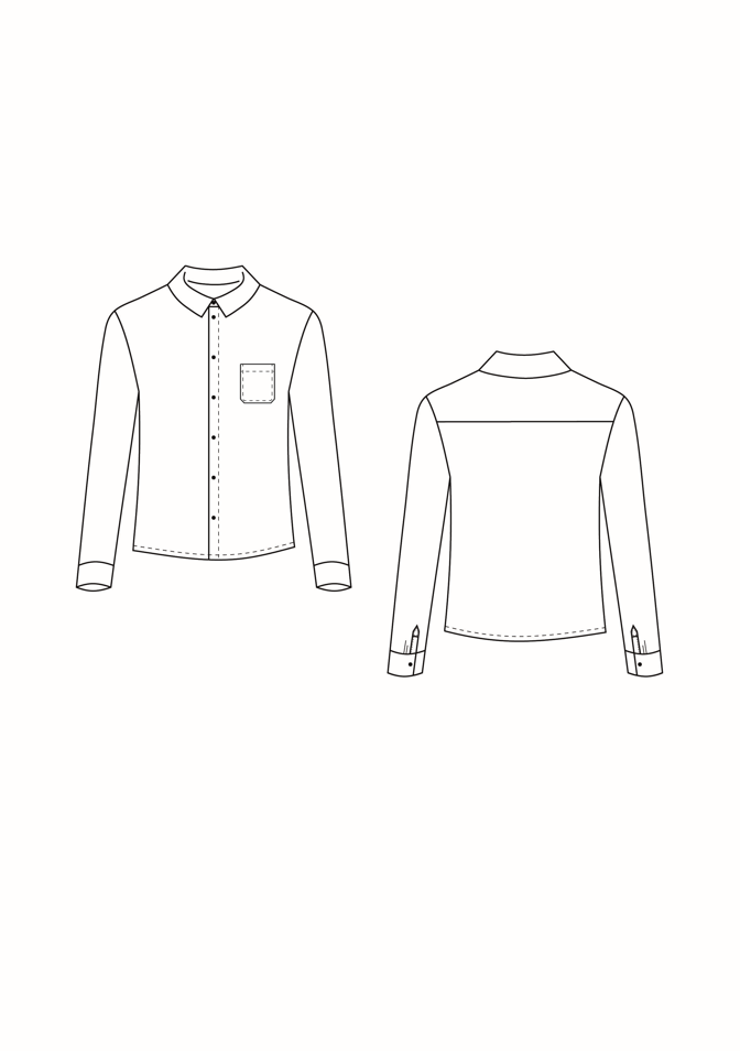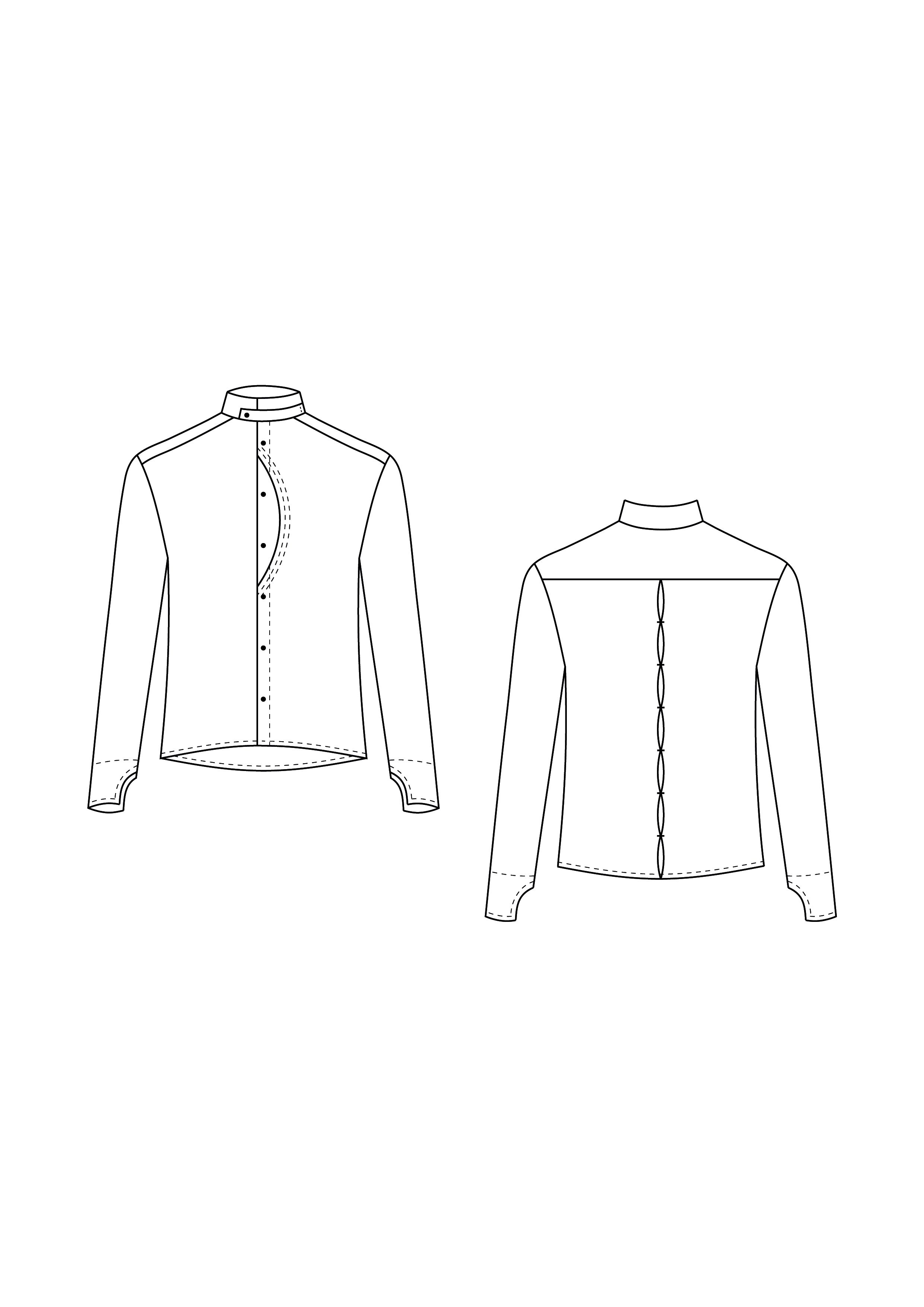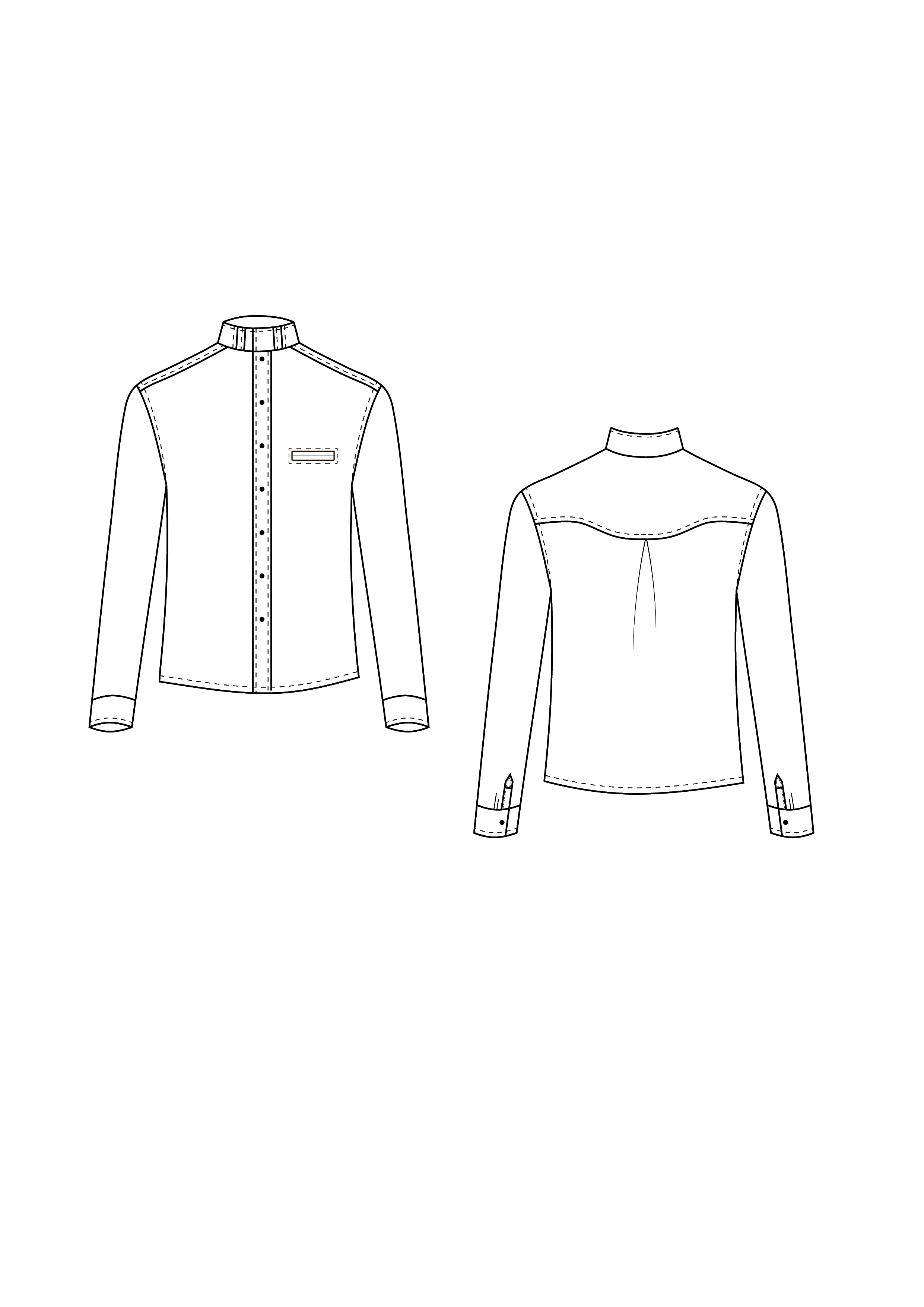 • prosty zapinany na guziki; • nakładana kieszonka na lewym przodzie (szerokość 11 cm, wysokość 13 cm); • szwy boczne 1 cm; • szwy kołnierza i stójki 0,5 cm, szew przyszywania stójki do podkroju szyi 0,7 cm
