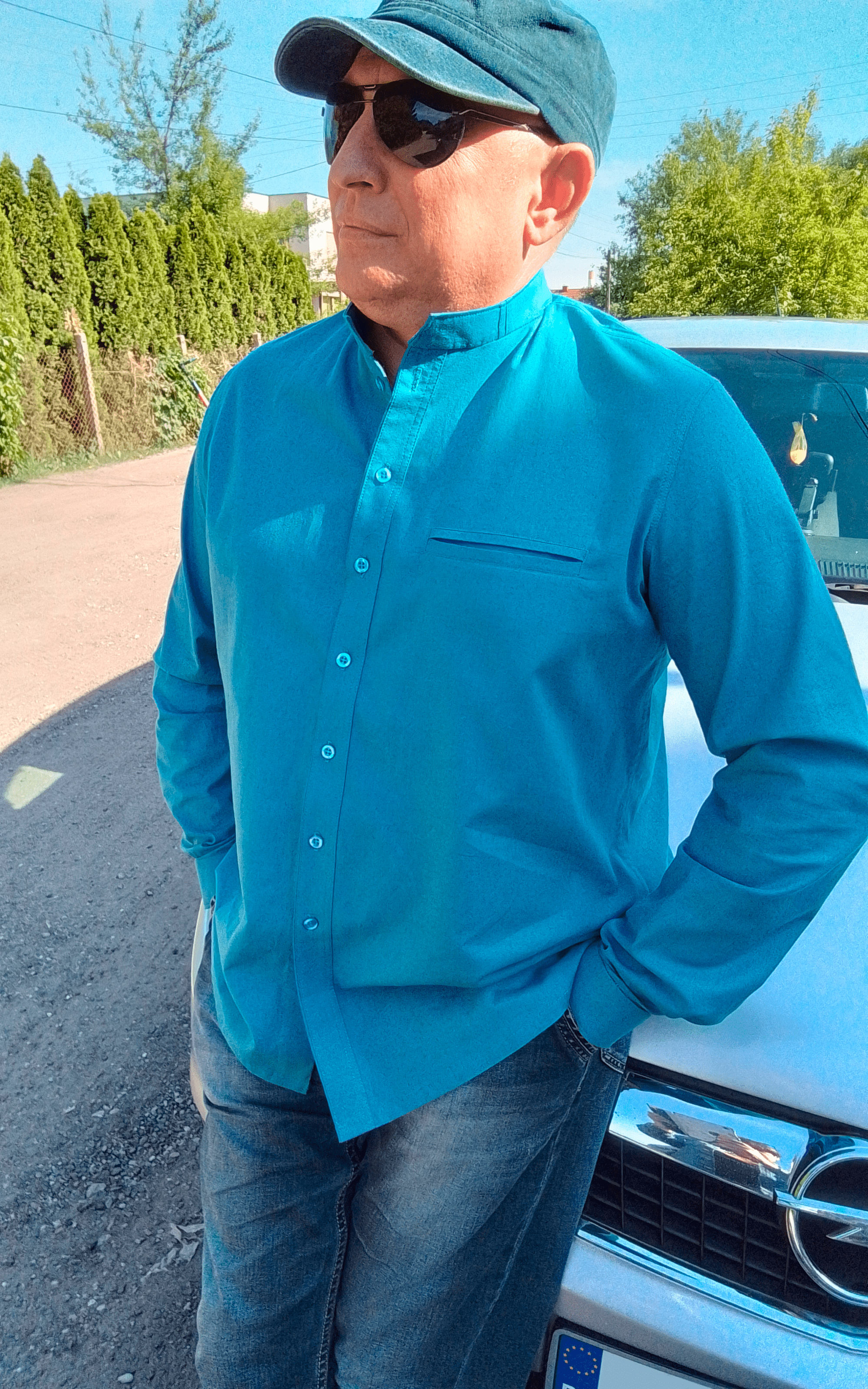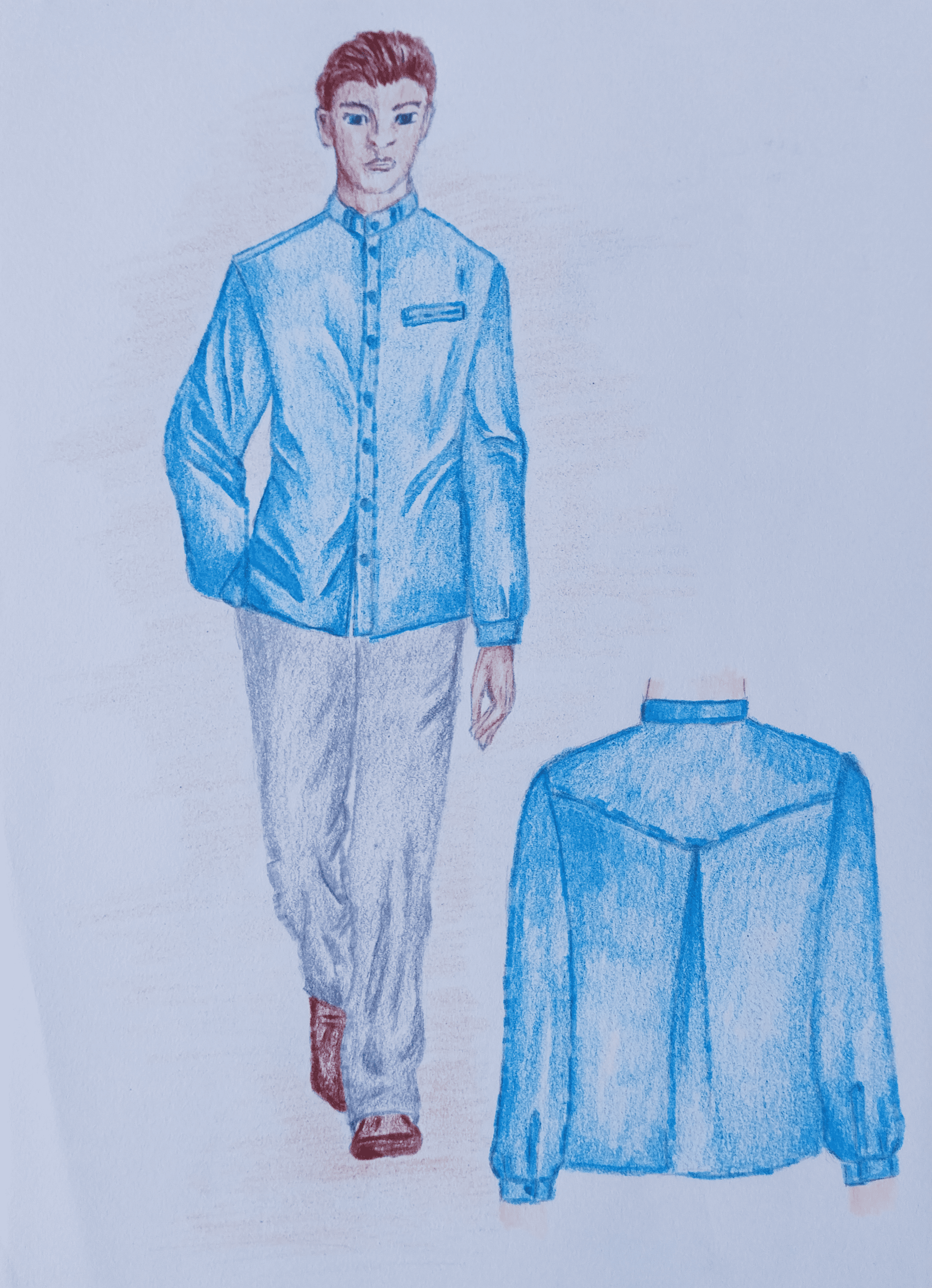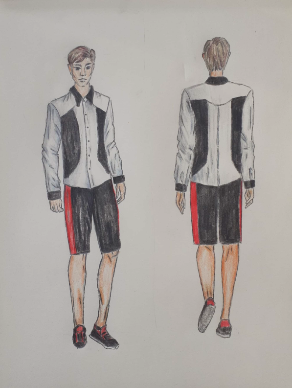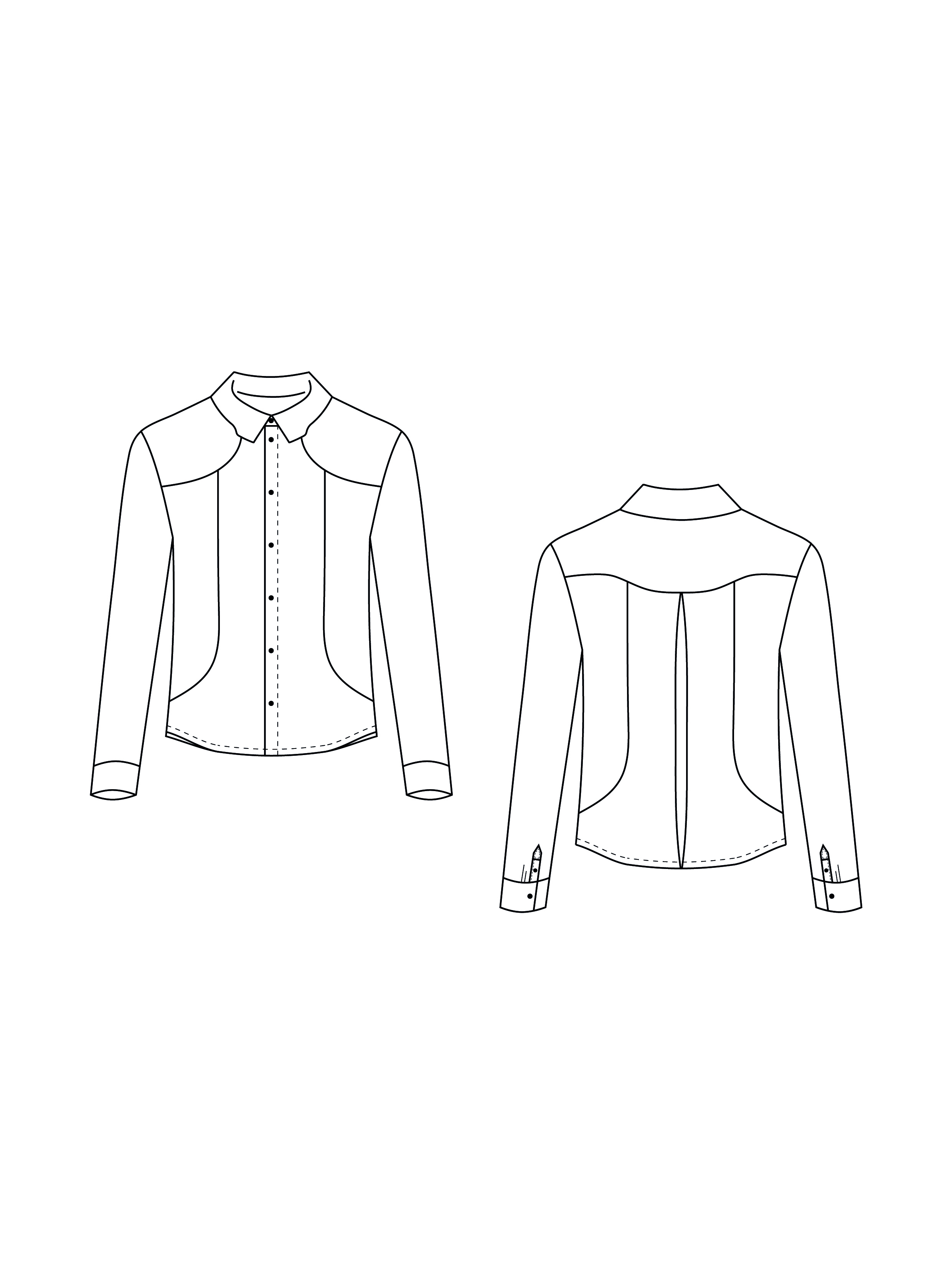 • prosty zapinany na guziki; • nakładana kieszonka na lewym przodzie (szerokość 11 cm, wysokość 13 cm); • szwy boczne 1 cm; • szwy kołnierza i stójki 0,5 cm, szew przyszywania stójki do podkroju szyi 0,7 cm