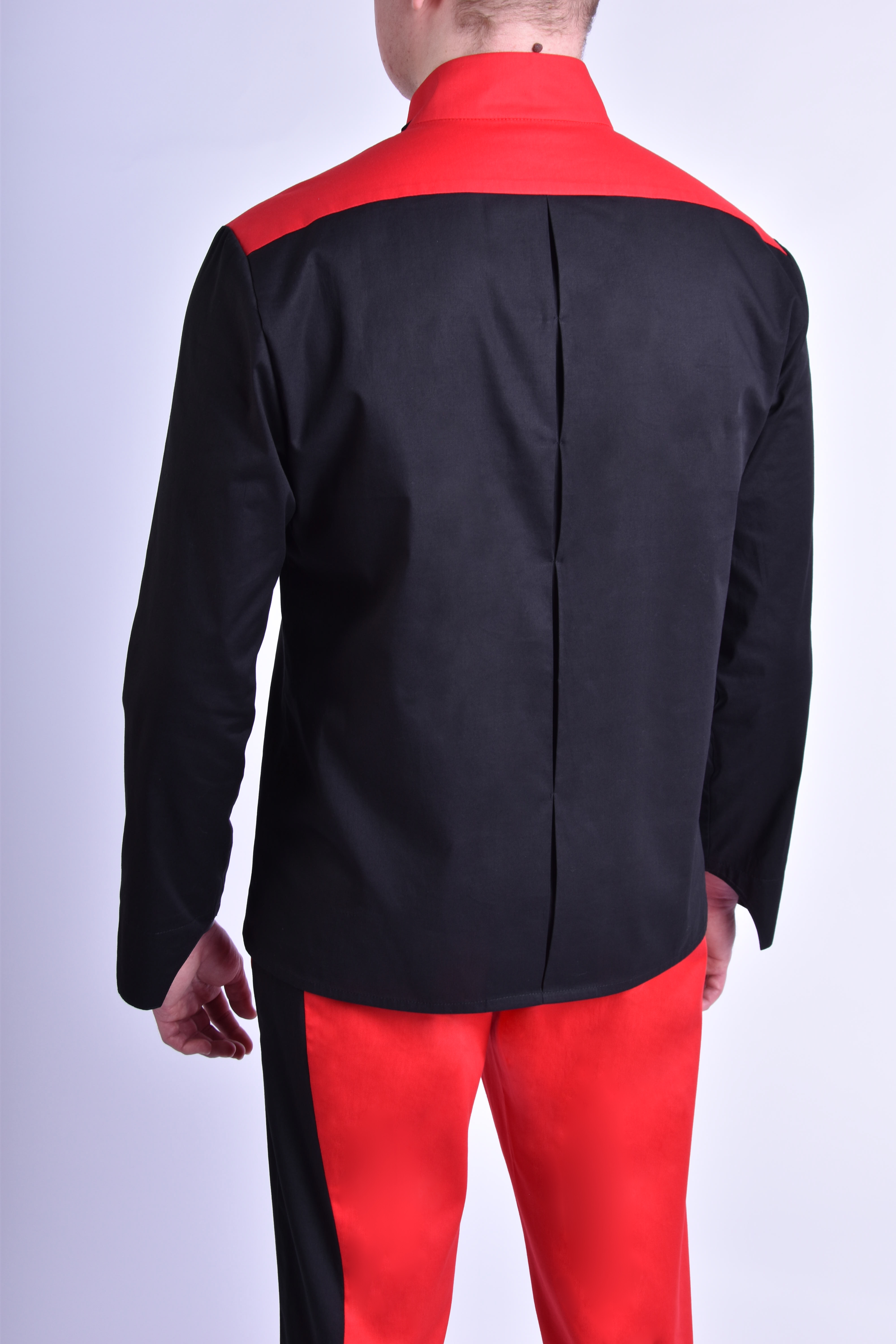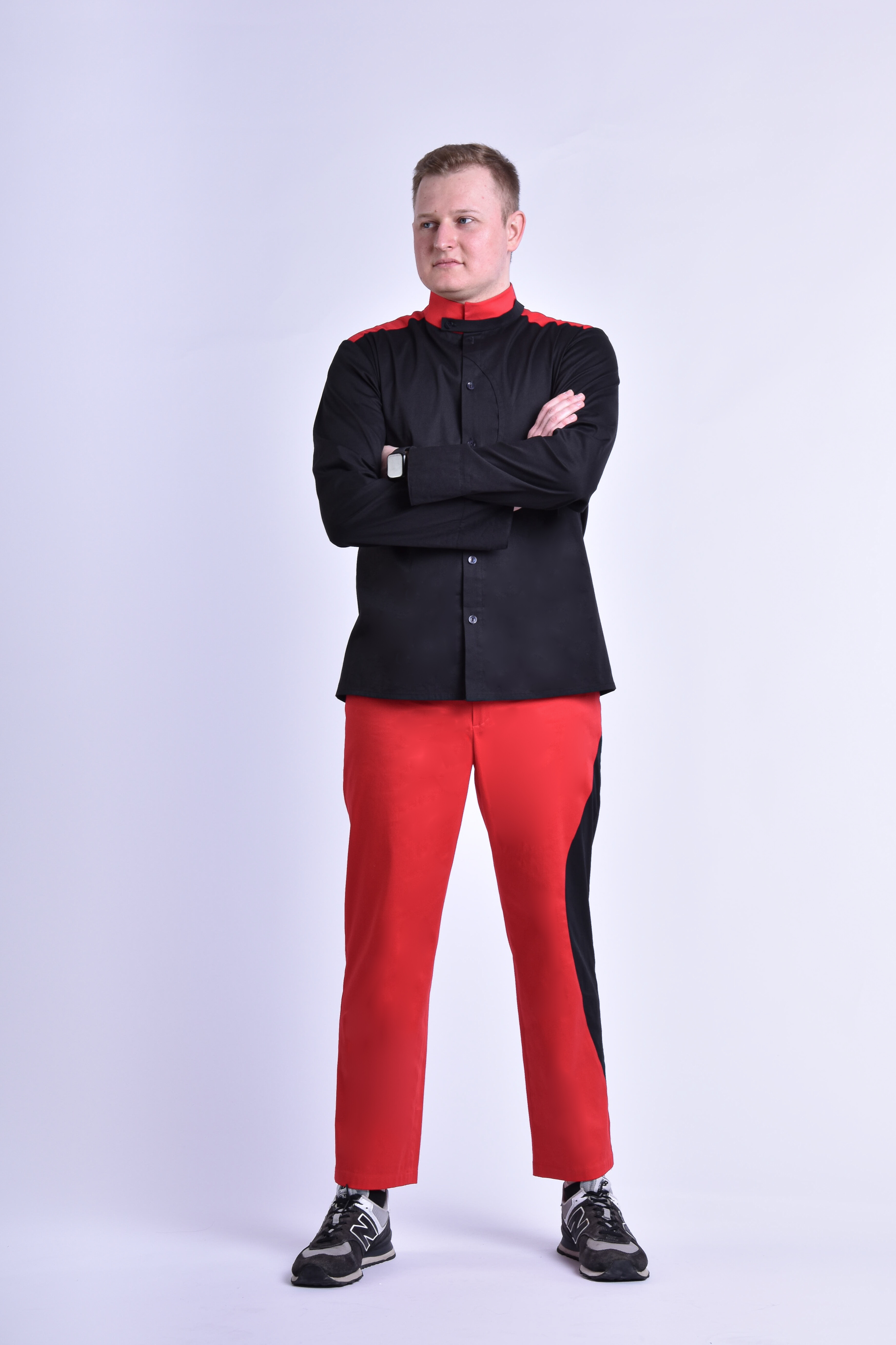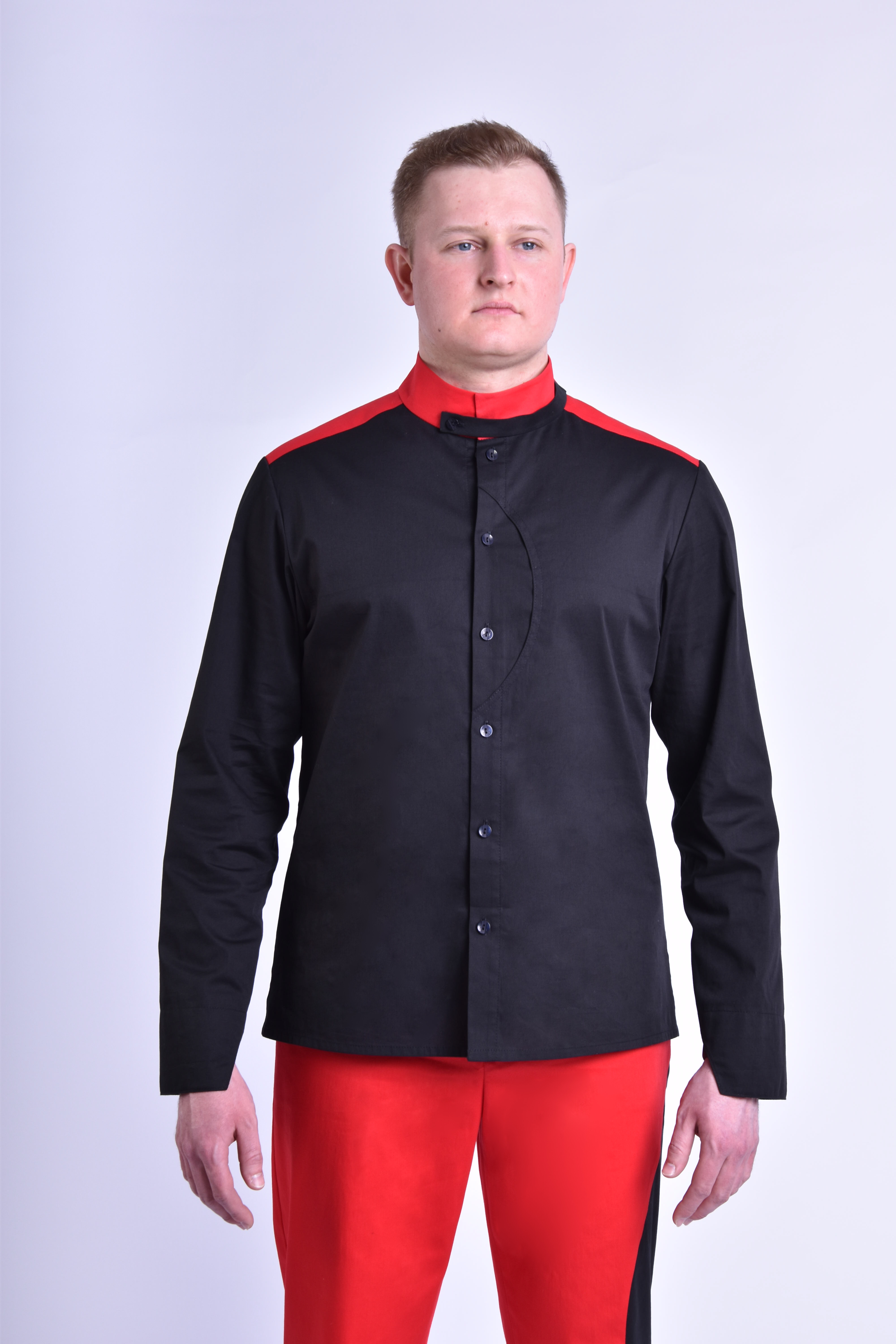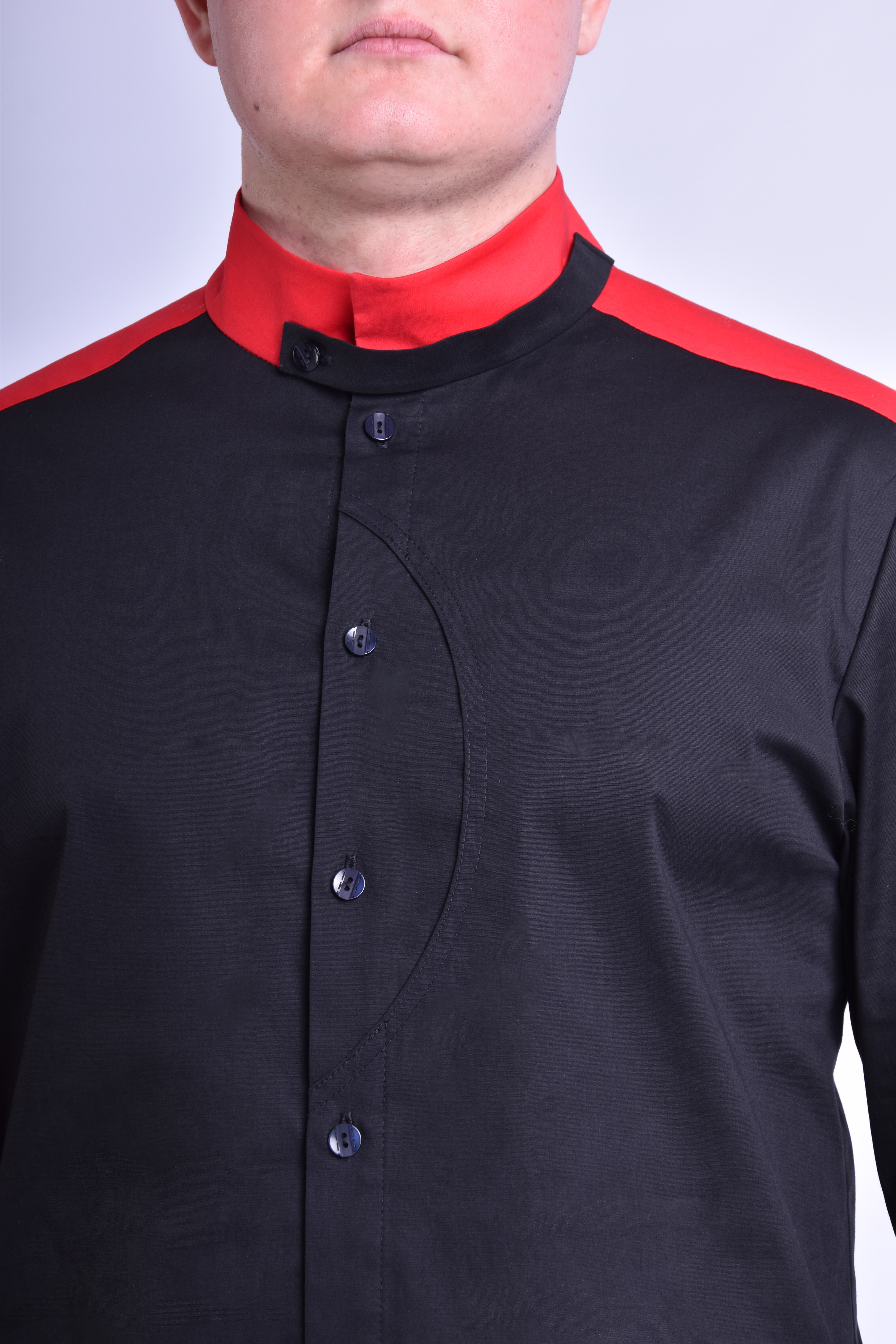 • prosty, аsymetryczny, zapinany na guziki; • szwy boczne 1 cm; • szerokość stójki 5 cm; • szerokość szlufki stójki 2 cm; • szwy stójki 0,5 cm, szew przyszywania stójki do podkroju szyi 0,7 cm