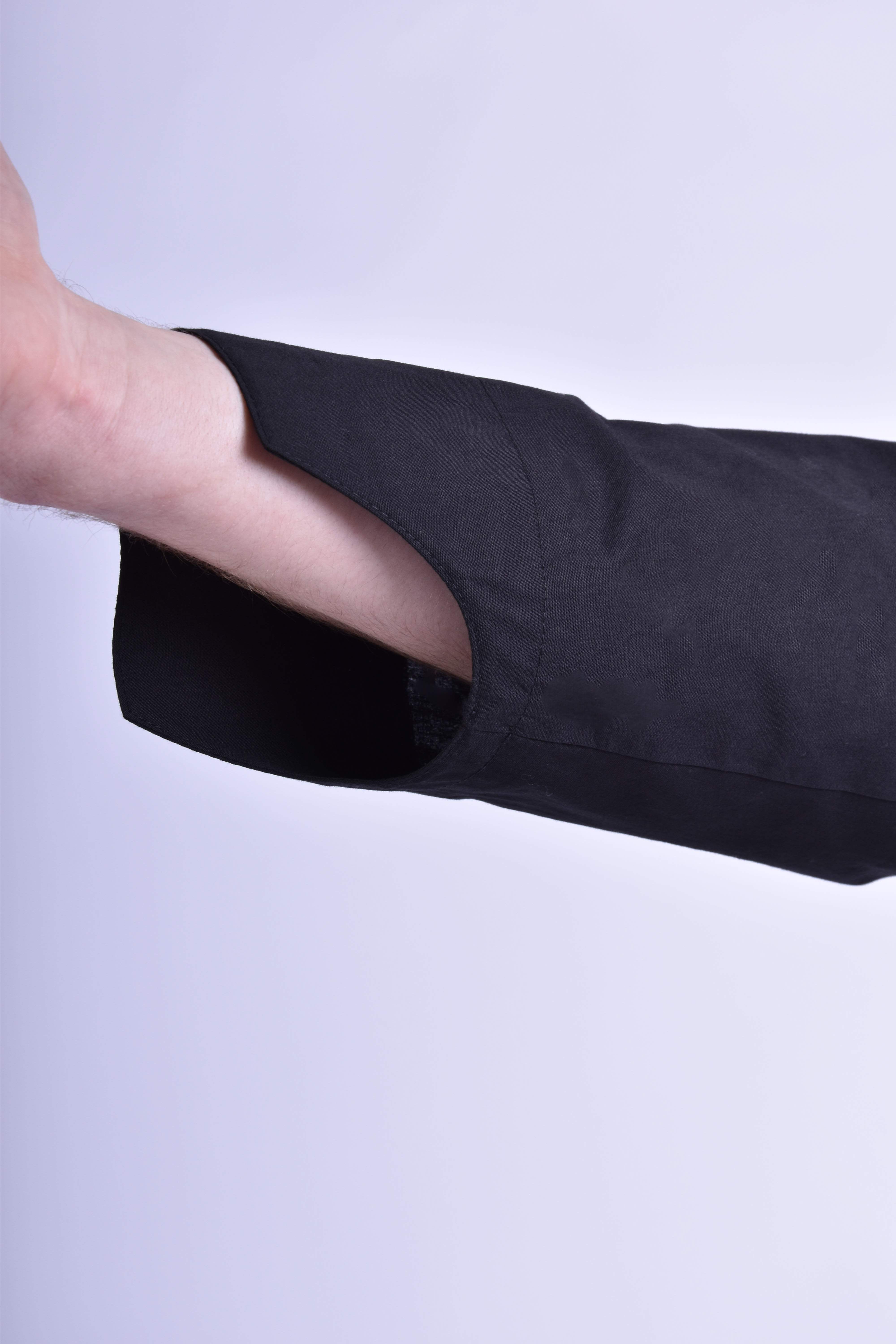 • rękawy długie z dwoma fałdami na każdym; • rękaw ma jeden szew (szew 1 cm); • rozporek wykończony domkiem klasycznym (długość 11 cm); • mankieta do rękawa (szerokość 5 cm), zapinane na 1 guzik; • szwy mankiet 0,5 cm, szew przyszywania mankiet do rękawa 1 cm