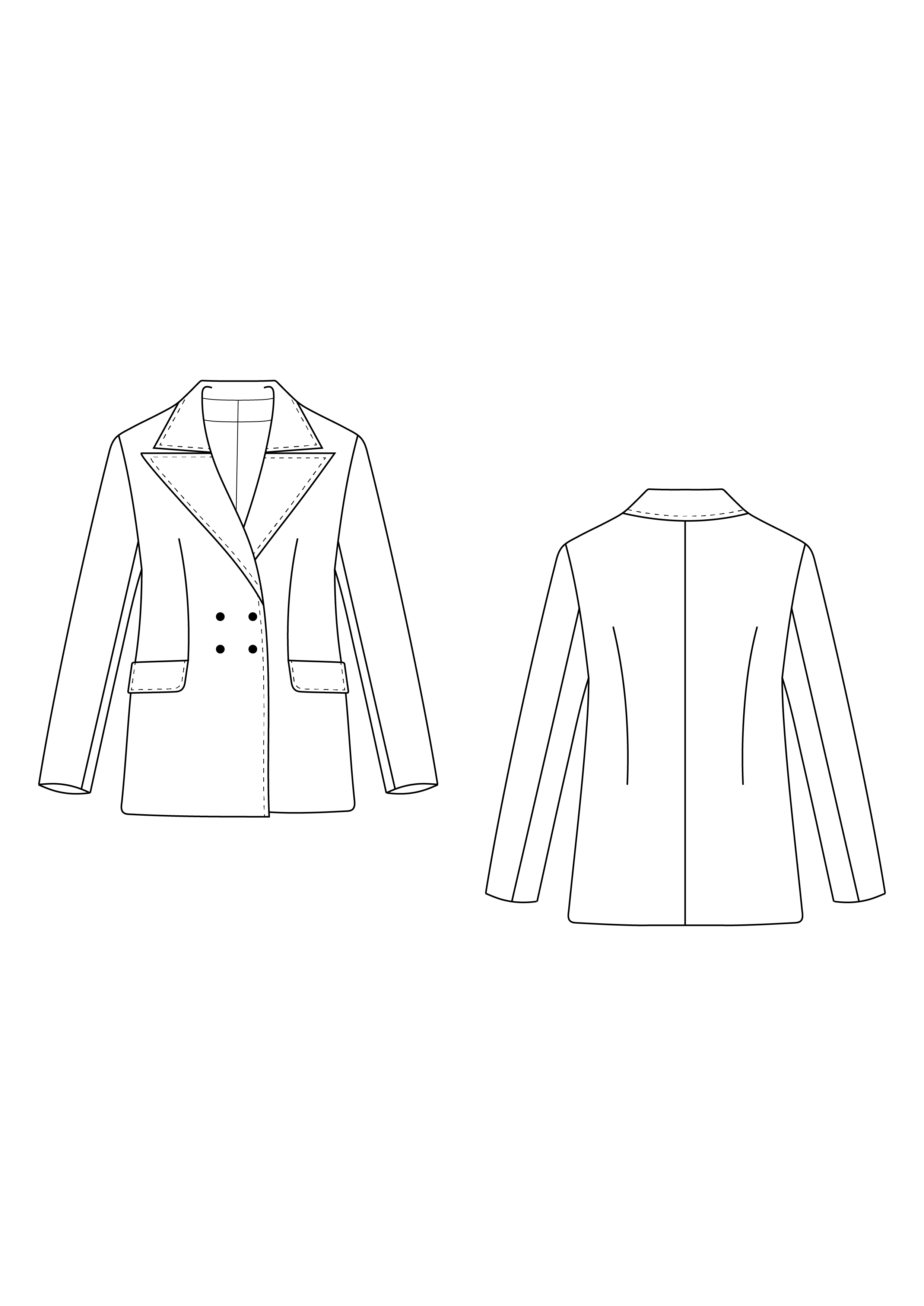 • składający się z dwóch części; • zapinany na guziki; • dwie zaszewki na talii; • dwie kieszeni z klapką, szerokość 17 cm; • szwy boczne 1,5 cm, pozostałe – 1 cm; • przód na podszewce z obłożeniem przodu; • szwy kołnierza 1 cm, szew przyszywania kołnierza do podkroju szyi 1 cm