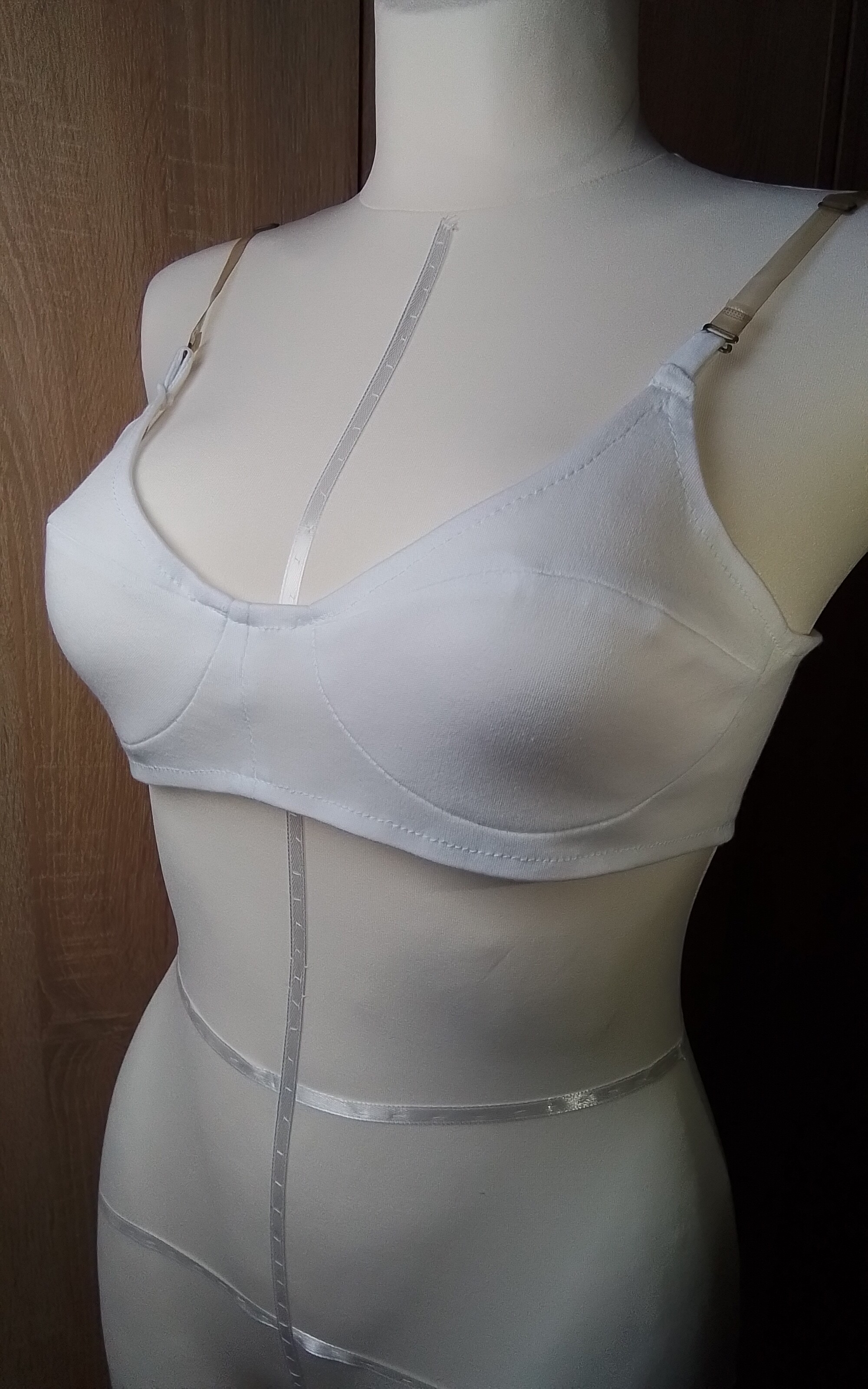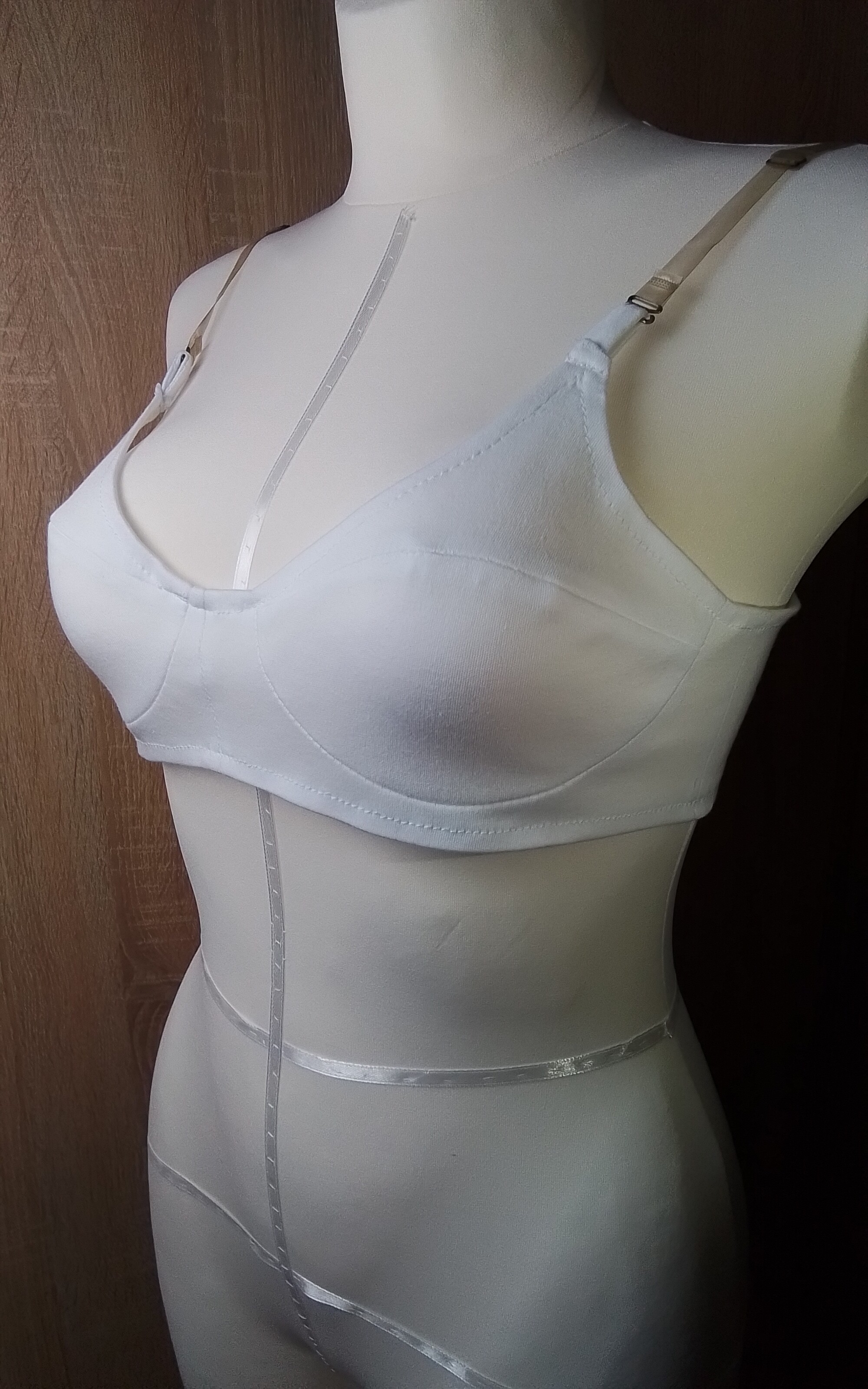 • miseczki biustonosza składające się z dwóch części; • dodatki na szwy 0,7 cm; • 4 plastikowe regulatory; • 2 ramiączki góry, długość do 40 cm(z gumy bieliźnianej); • szerokość pasa na bocznej części 10 cm; • na bocznej części pasa naszyte tuneli gorseciarskie z fiszbinami